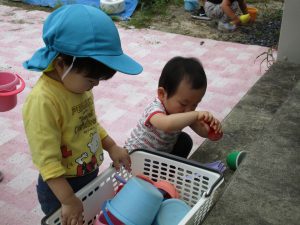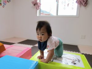 今日は0歳児さんはダンボール箱の積木とボール遊び、