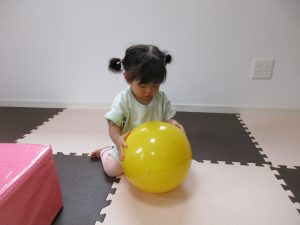 ボール遊びをしたり、ダンボール箱の積木に上がったり