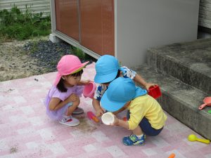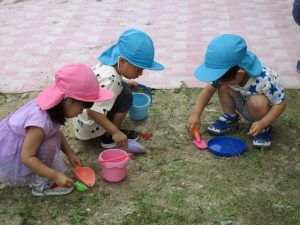 土や草をバケツに集めたり、先生が捕まえてくれた