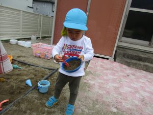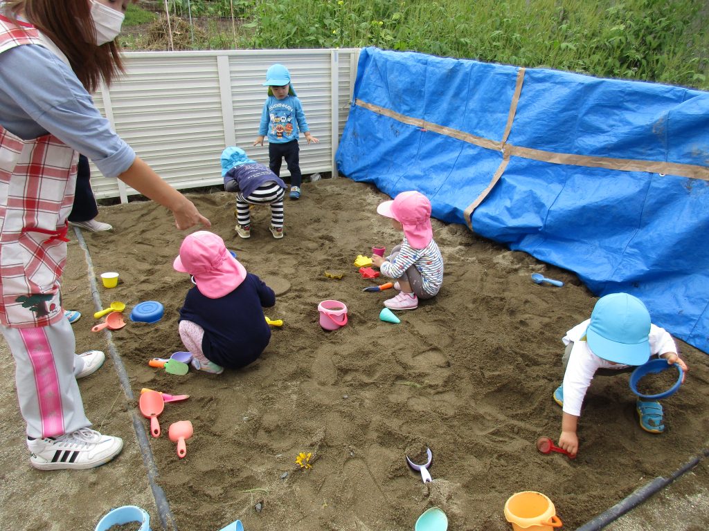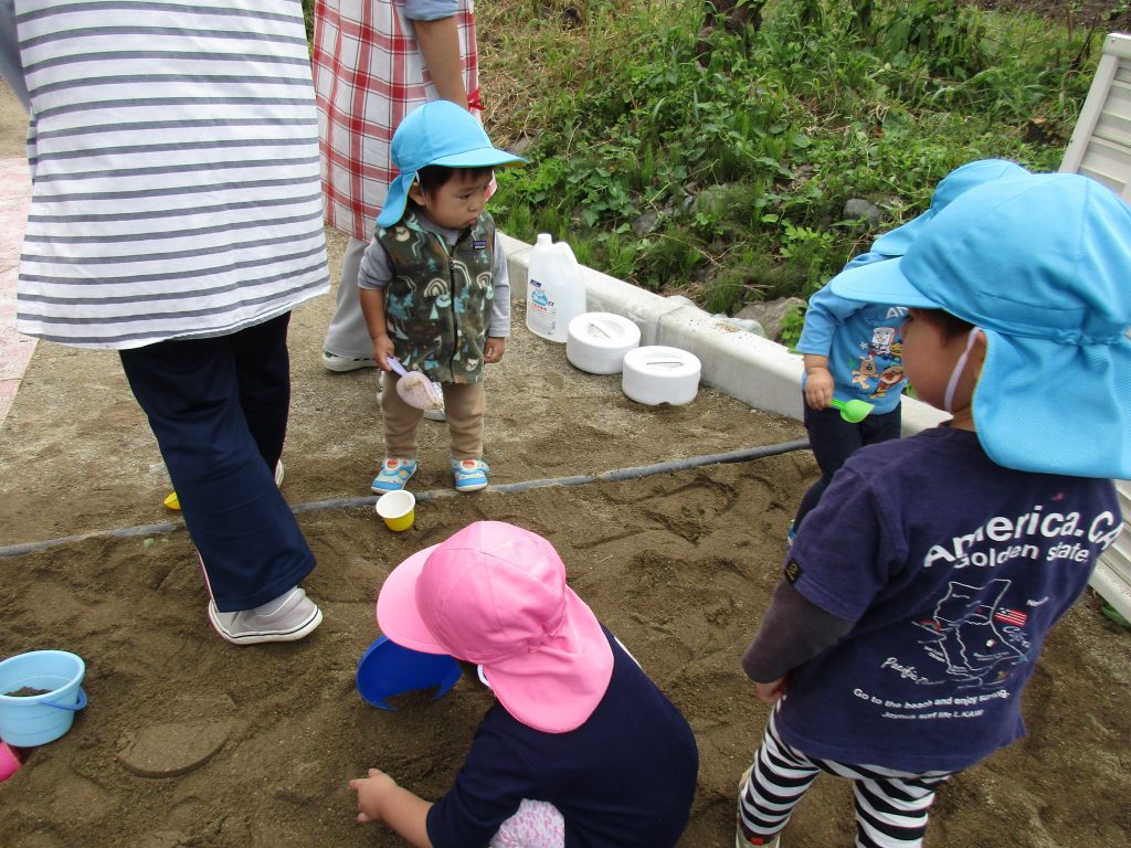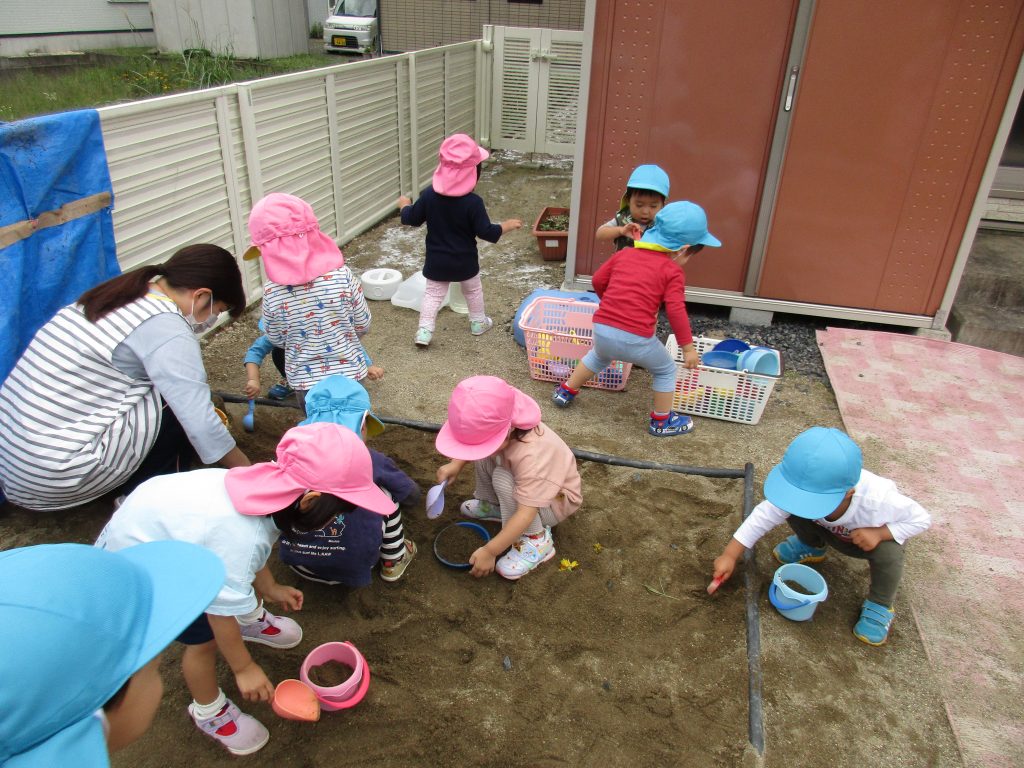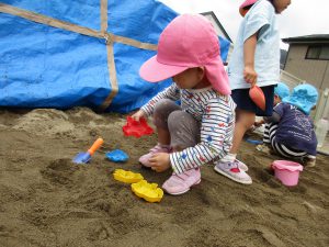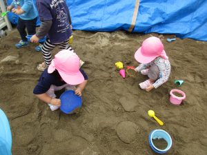 砂場では玩具を砂の中に埋めて、それを掘り出しては宝探しごっこをしたり、