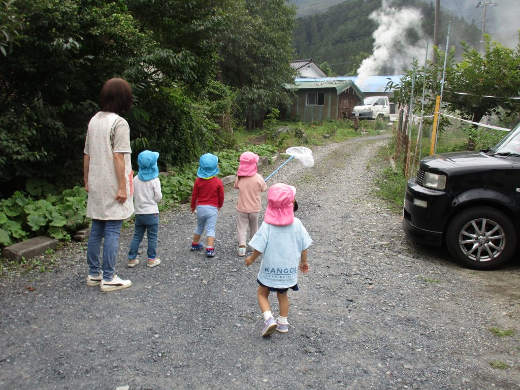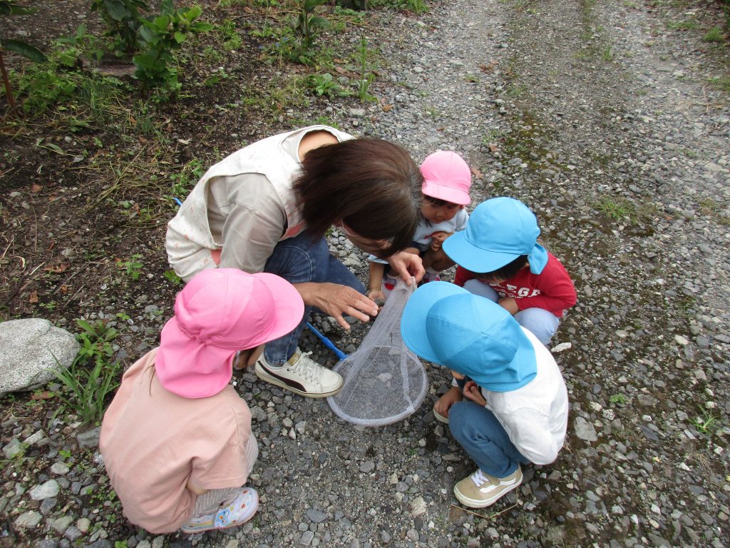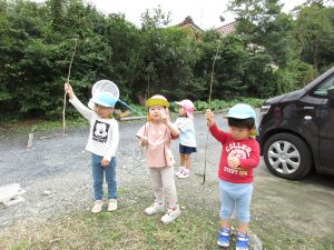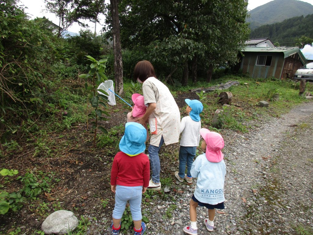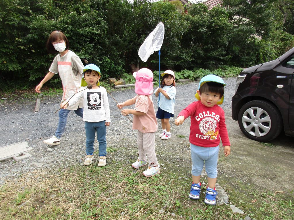 虫探しを始めたのは2歳児さん、虫取り網を持ってとんぼを捕まえようと