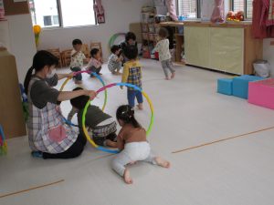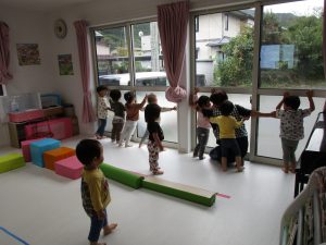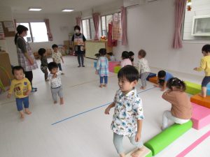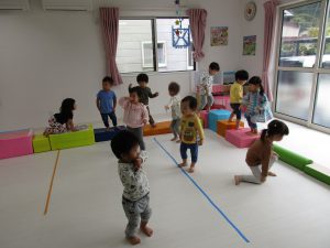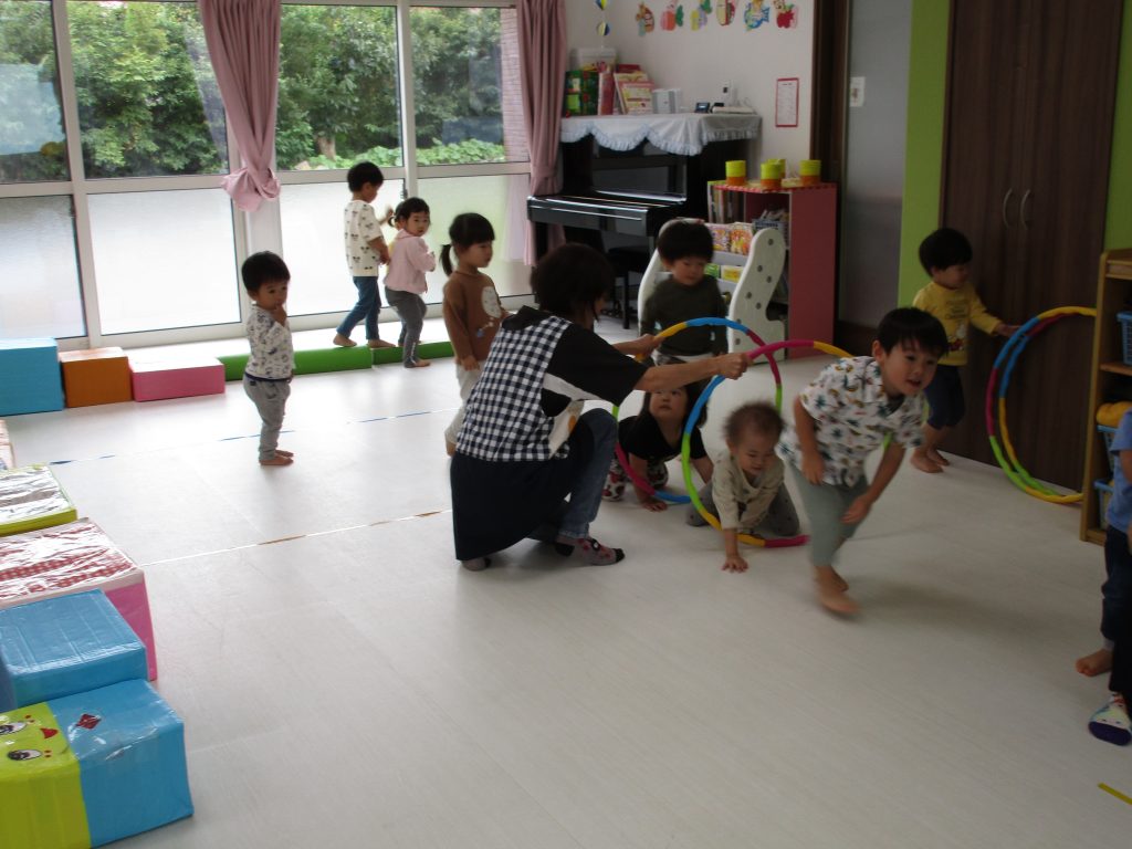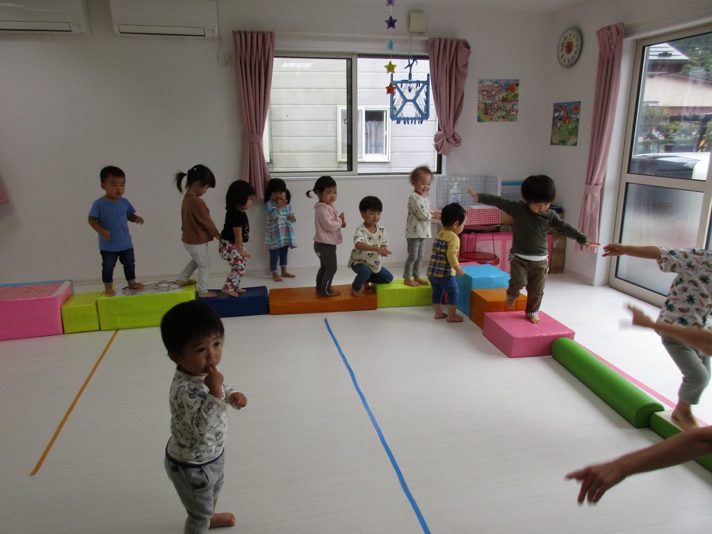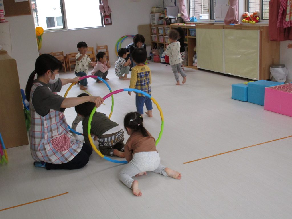 ダンボール箱の積木の上を歩いたり、フラフープのトンネルを