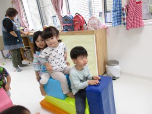 手作り段ボールの積み木を乗り物に