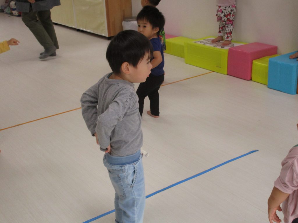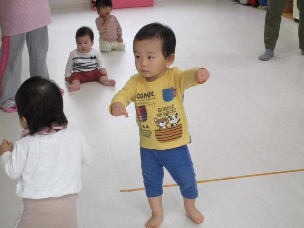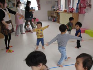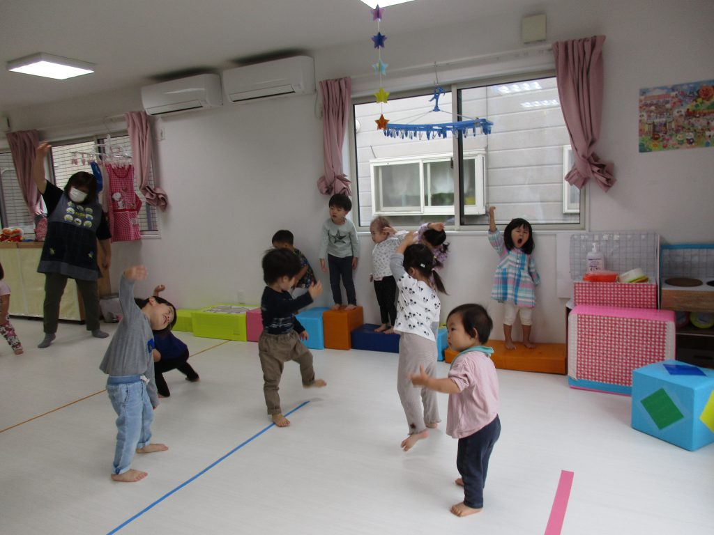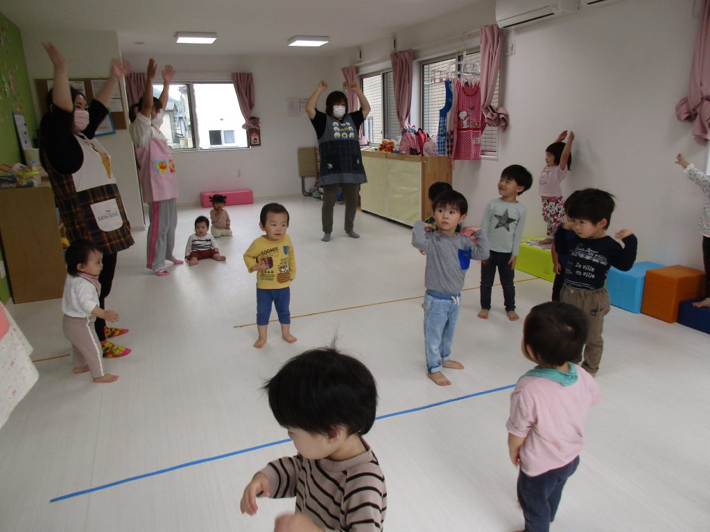みんな思い思いに保育士の真似をして