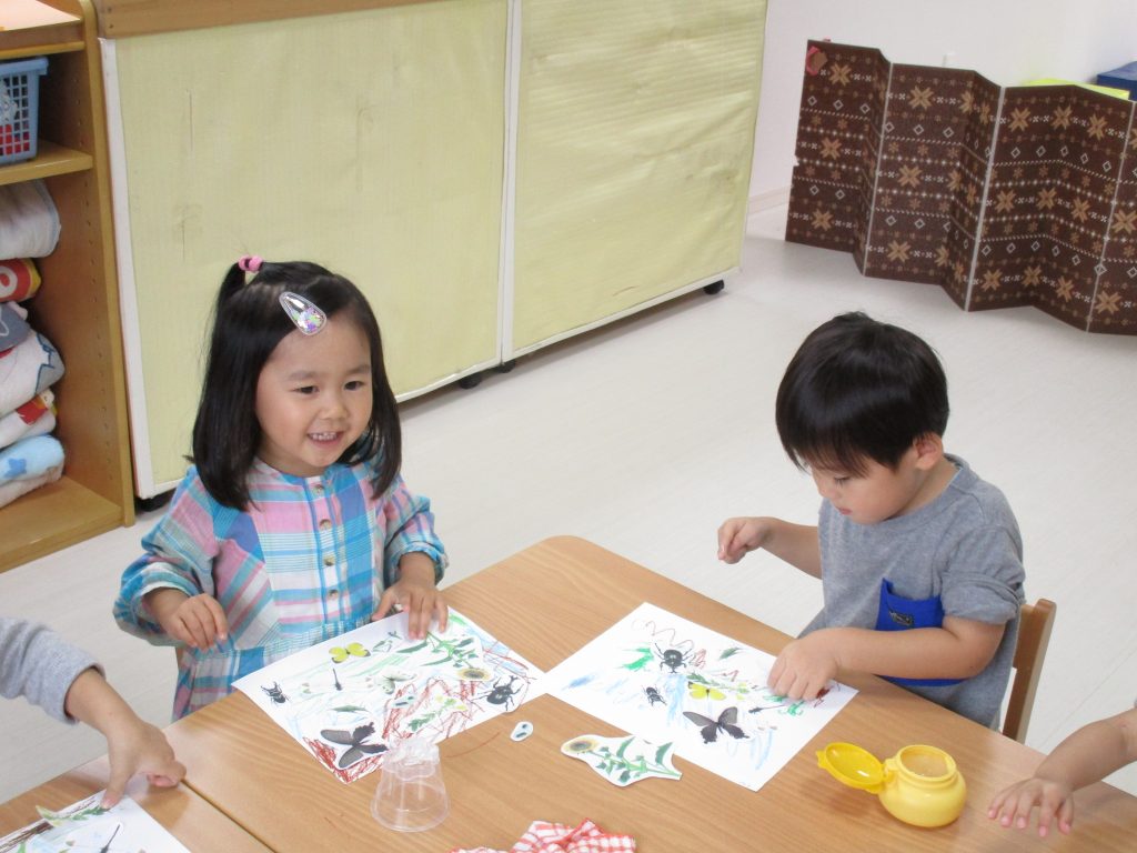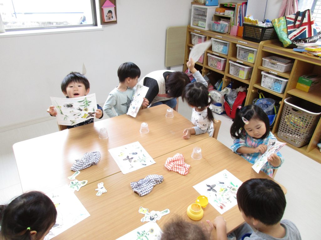 虫や季節の植物を貼り絵にして