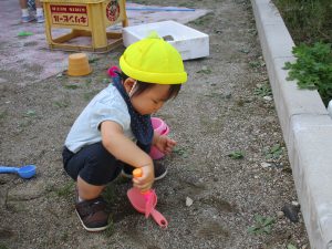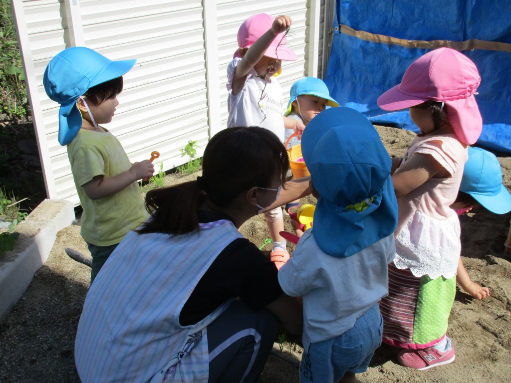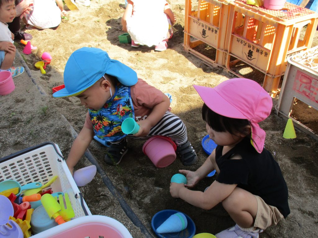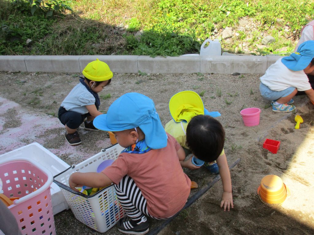 砂遊びをしようと砂場に向かいましたが、2歳児さんの数名は