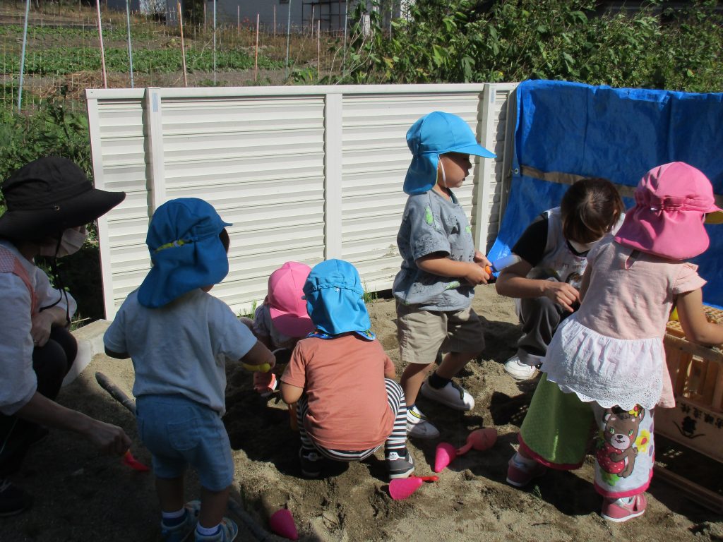 1・2歳児さんと一緒に砂遊びにも少しだけ参加しました(*^_^*)