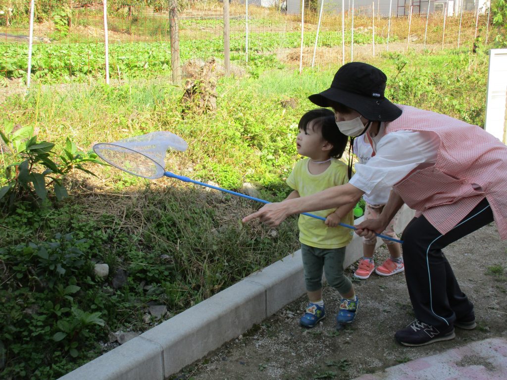 虫取り網を持って捕まえようと頑張り、先生と一緒に捕まえて大喜び!!