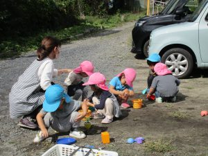 土を集めて容器にたくさん入れてケーキを作り、