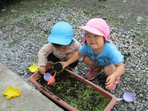 0歳児さんのお友達の手を取り、「砂場の方に行っちゃだめだよ」と