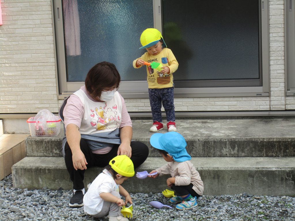 0歳児さんのお友達の手を取り、「砂場の方に行っちゃだめだよ」と