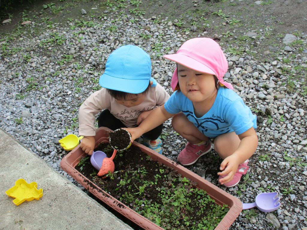 土を集めて容器にたくさん入れてケーキを作り、