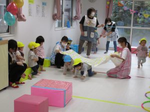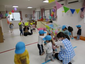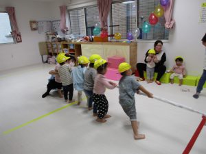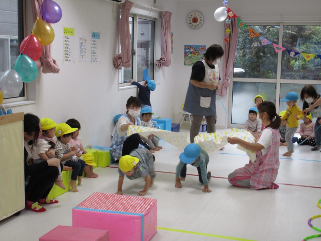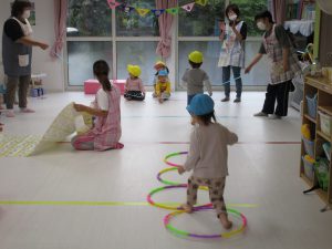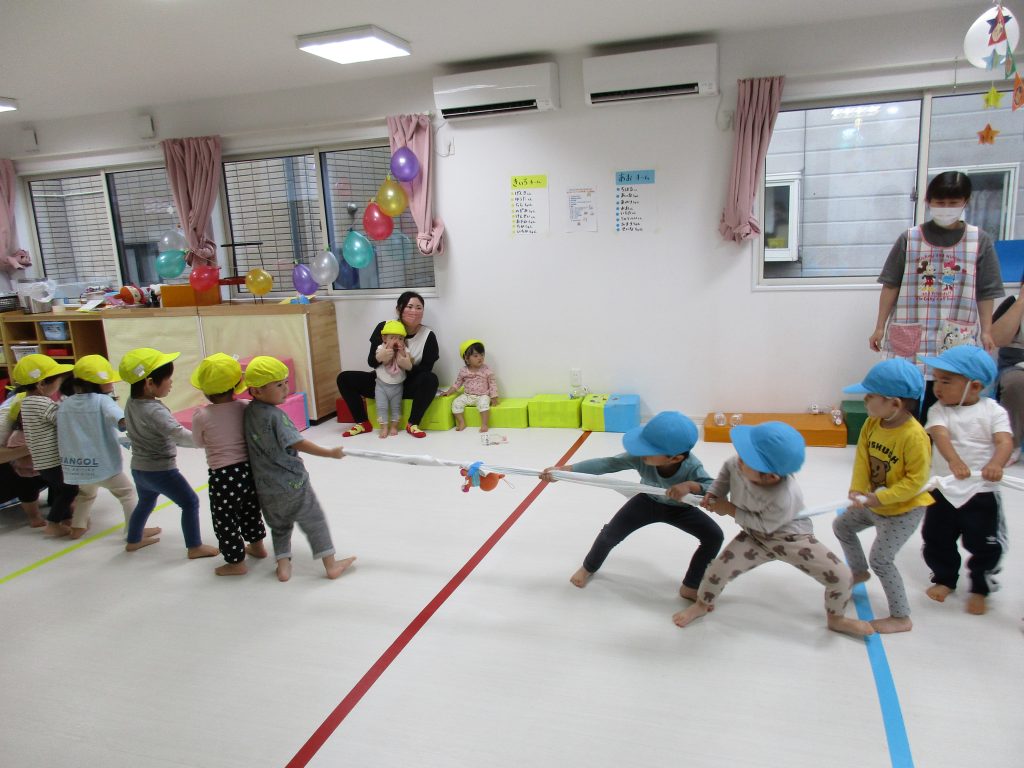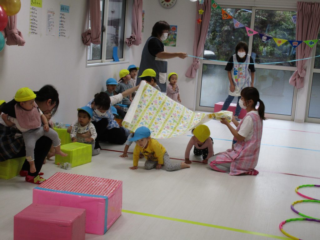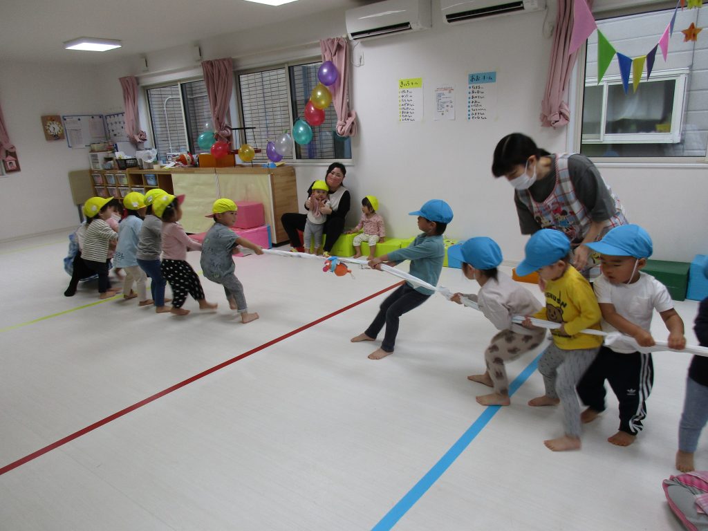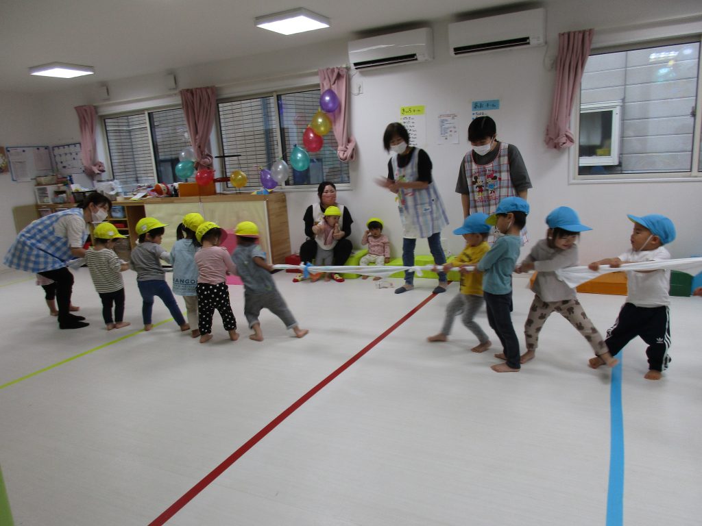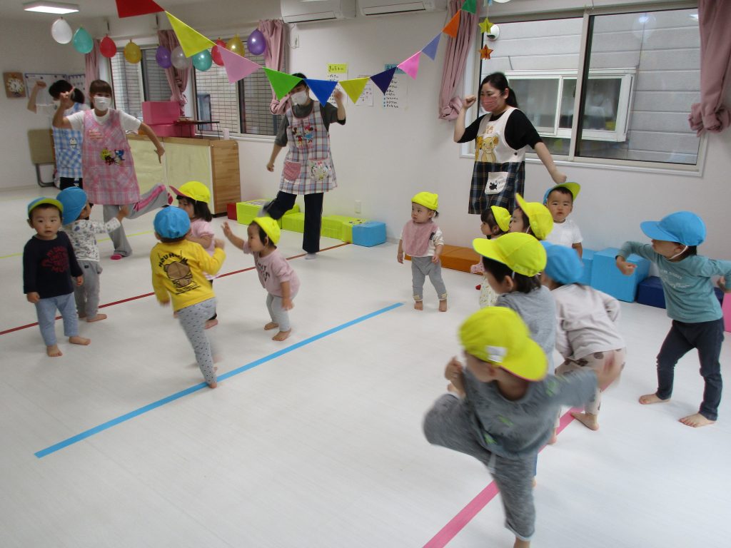 運動会らしくお部屋も装飾して、0・1・2歳児さん混合で