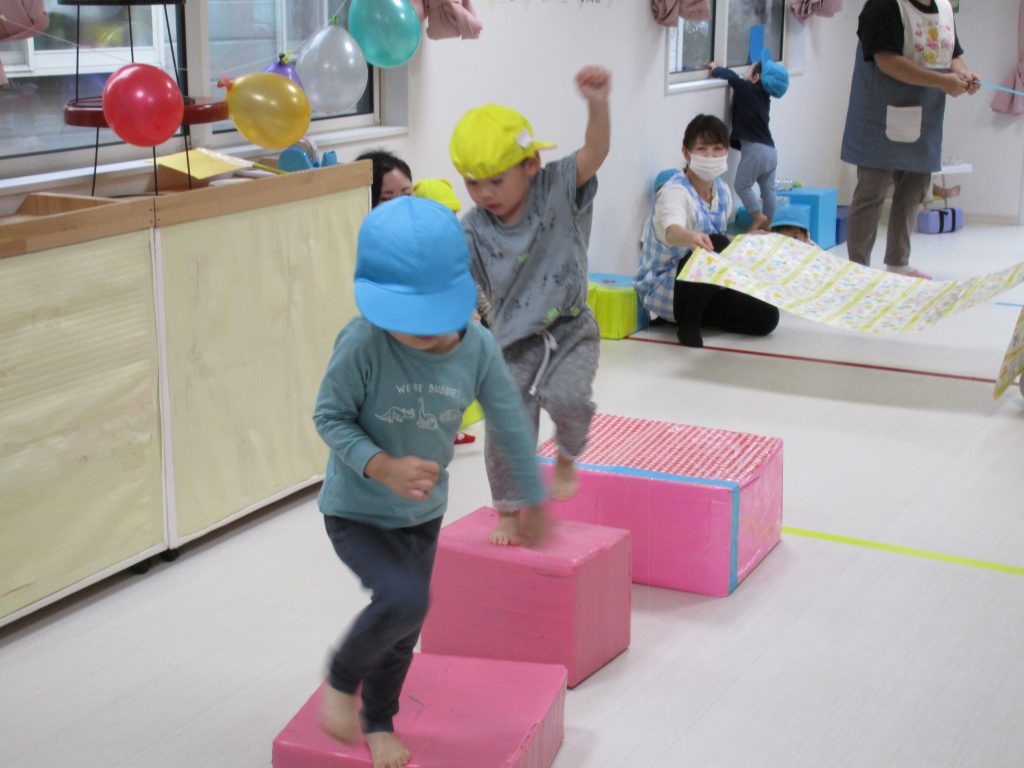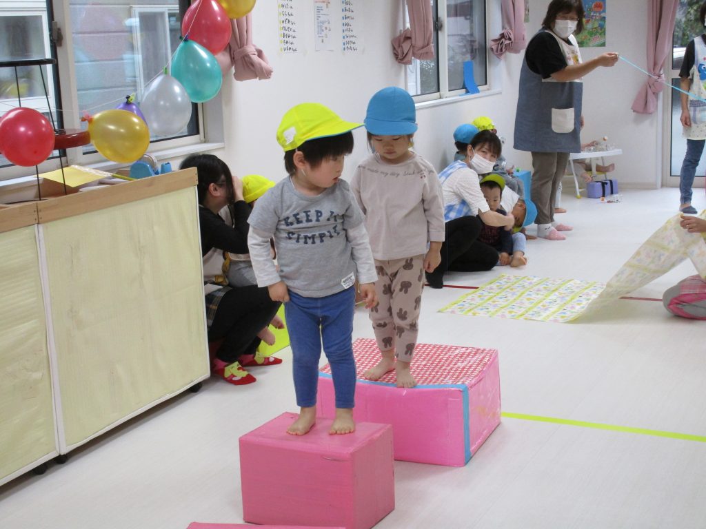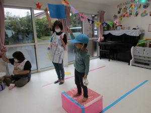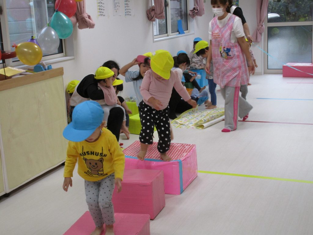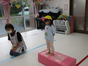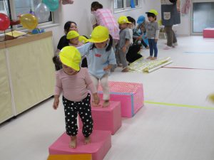 普段の遊びでダンボール箱の積木を渡って歩いているので
