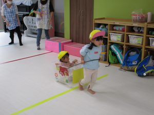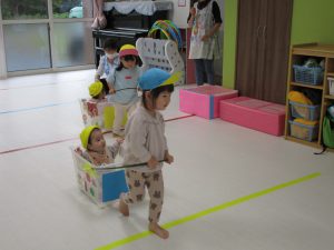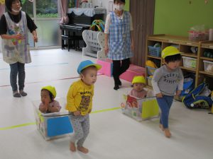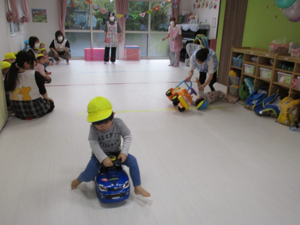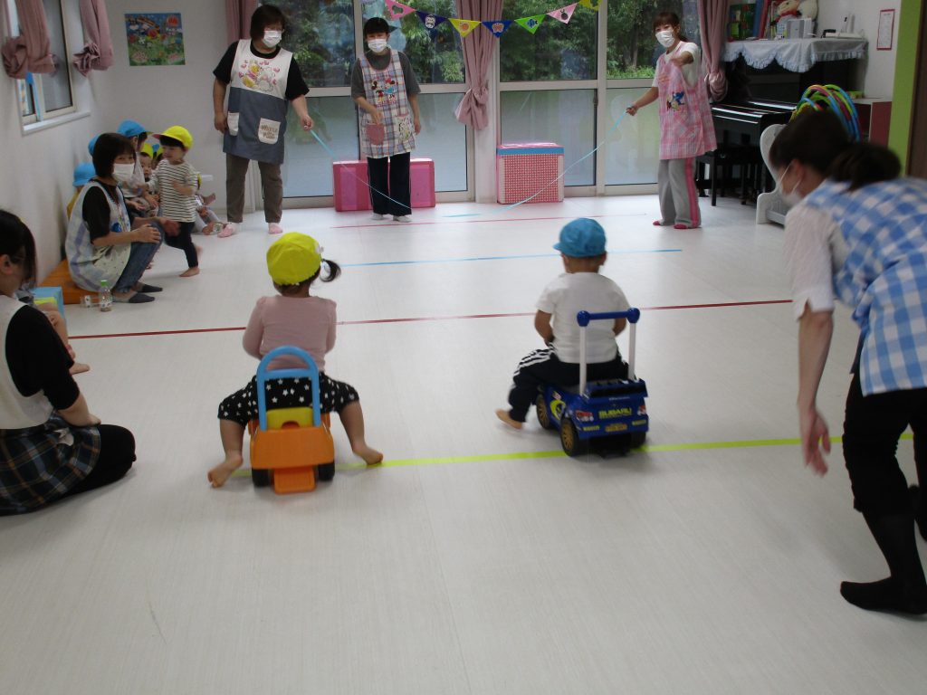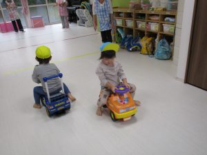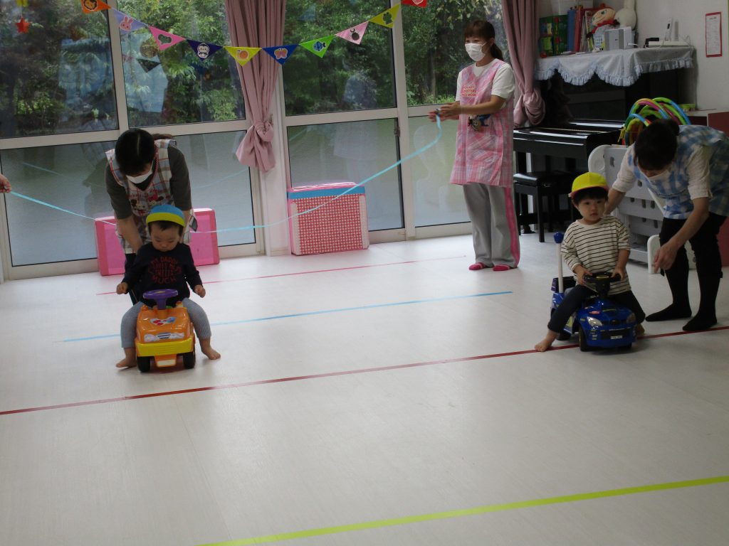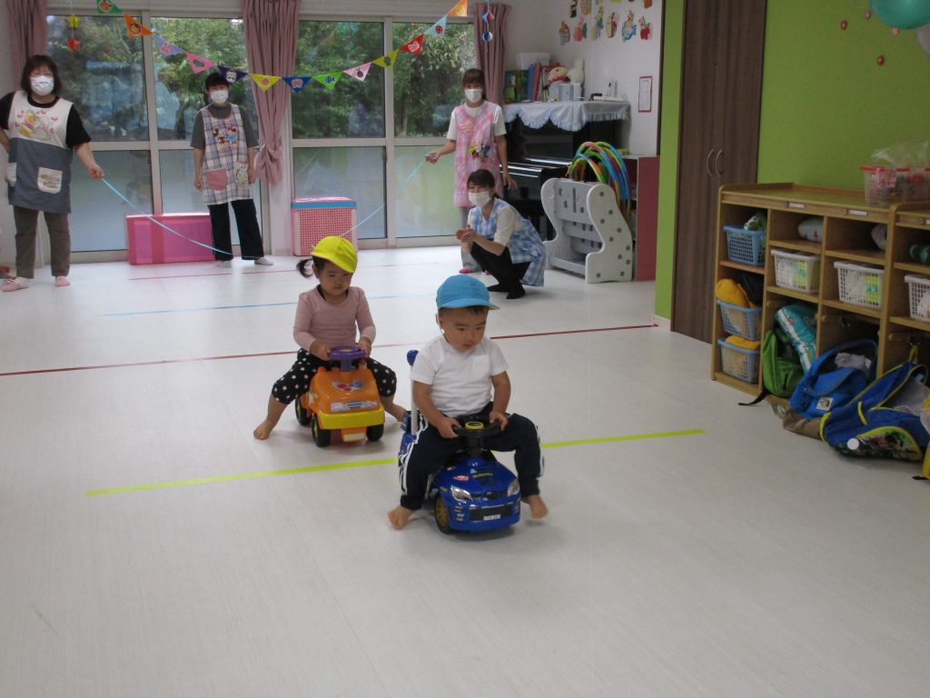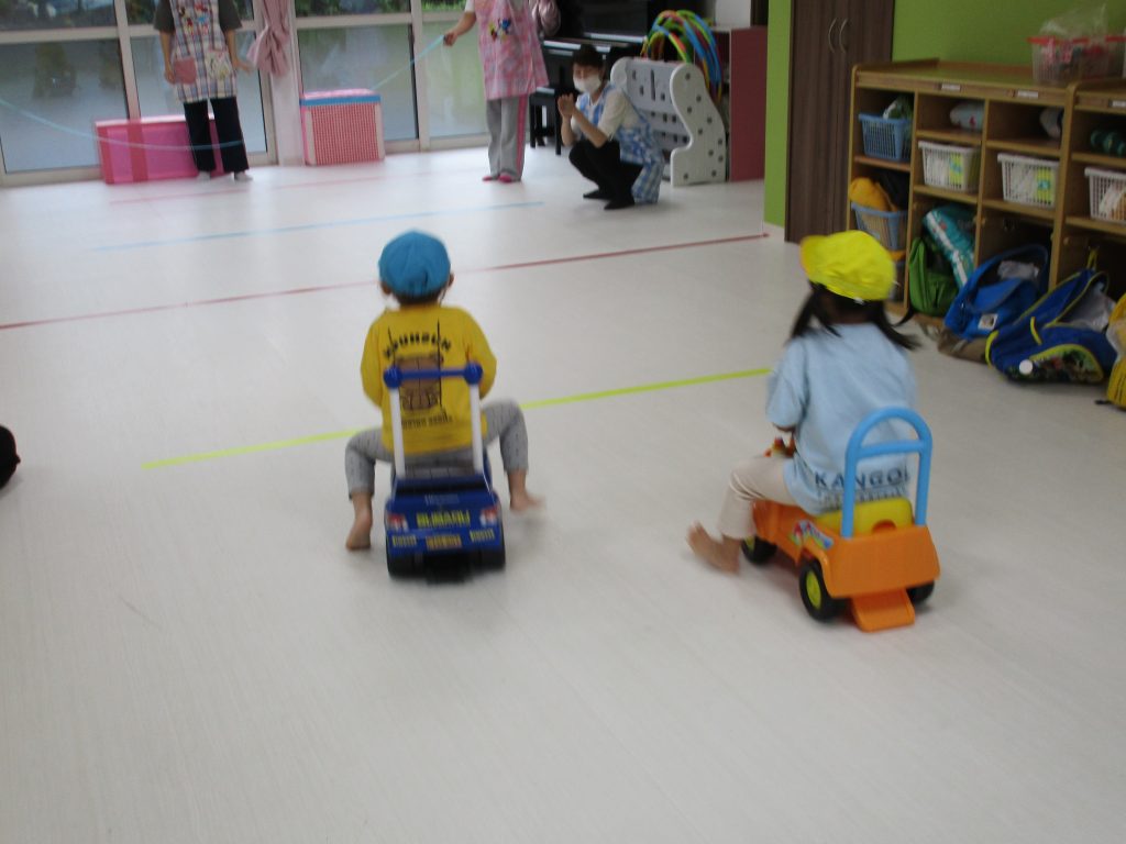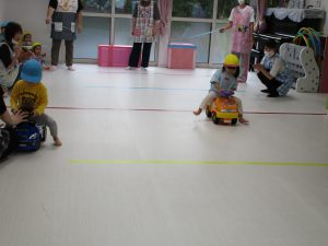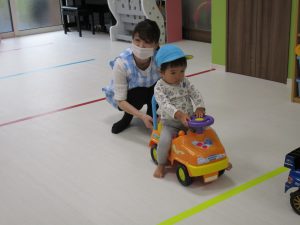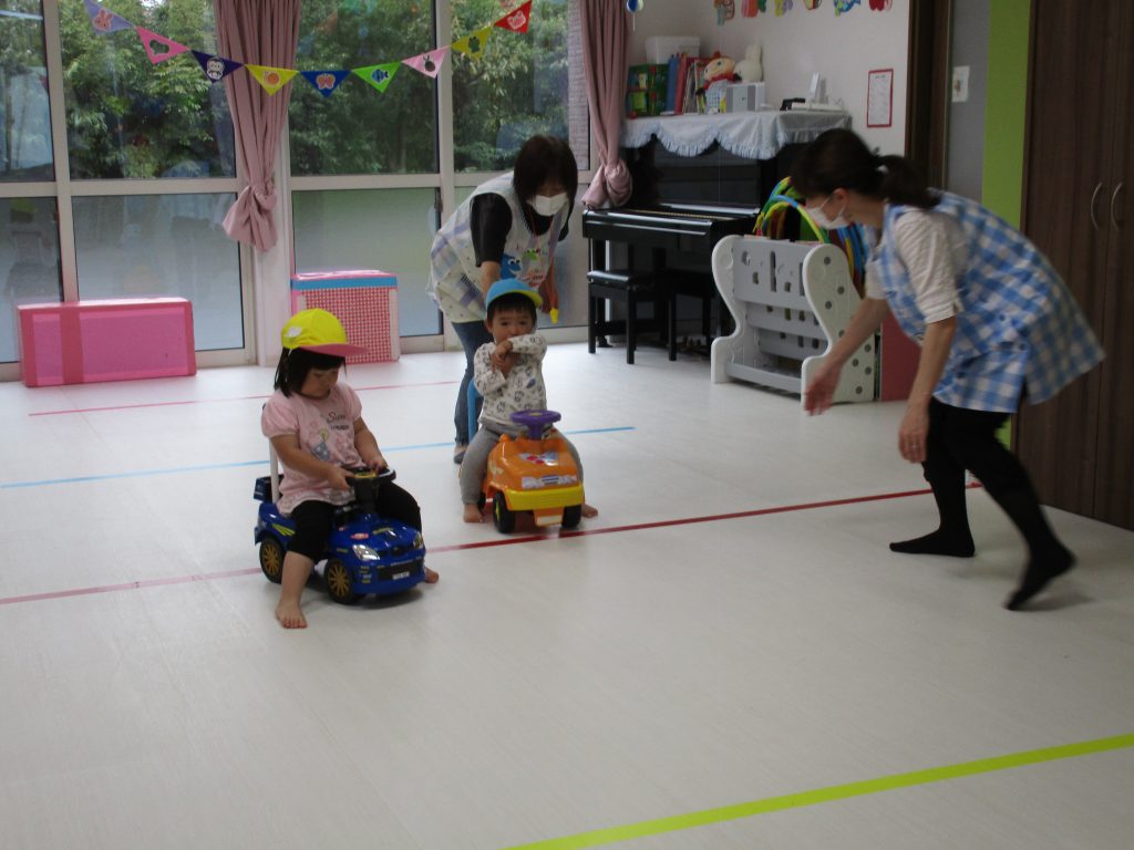 0歳児さんが乗っている車を、2歳児のおにいさん、おねえさんが
