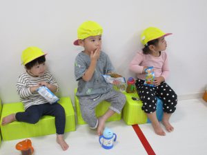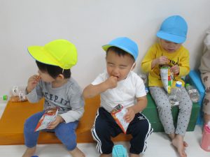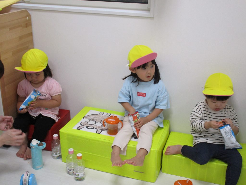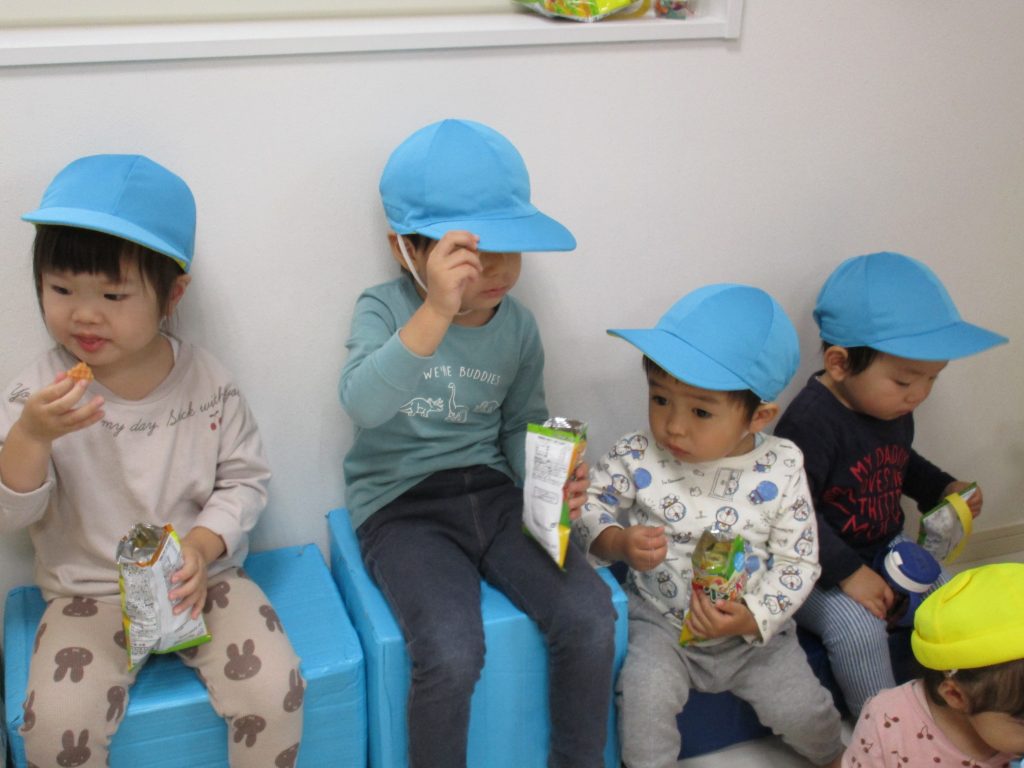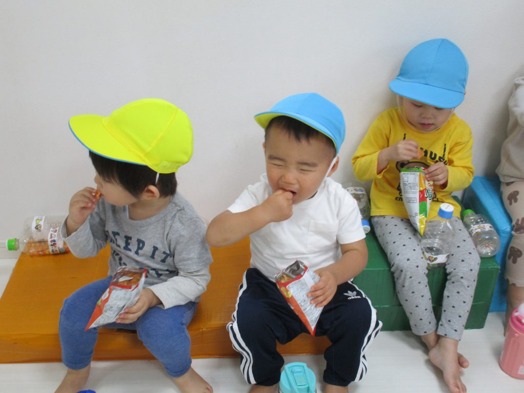 美味しそうにお菓子を食べたり、水筒のお茶を飲んで水分補給して、