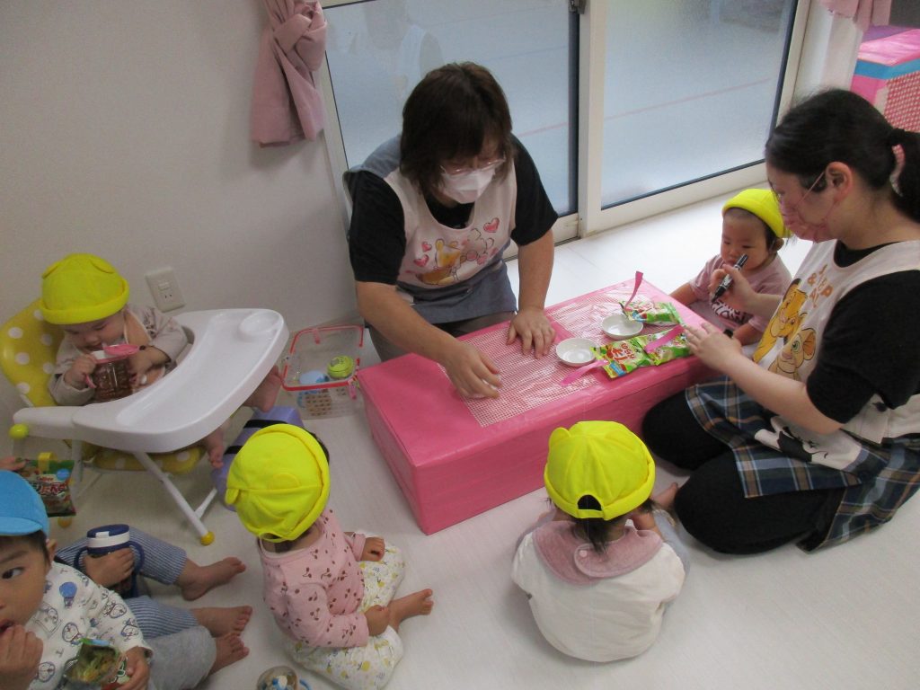 子ども達は手で取る予定でしたが、2歳児さんは先生達の真似をして