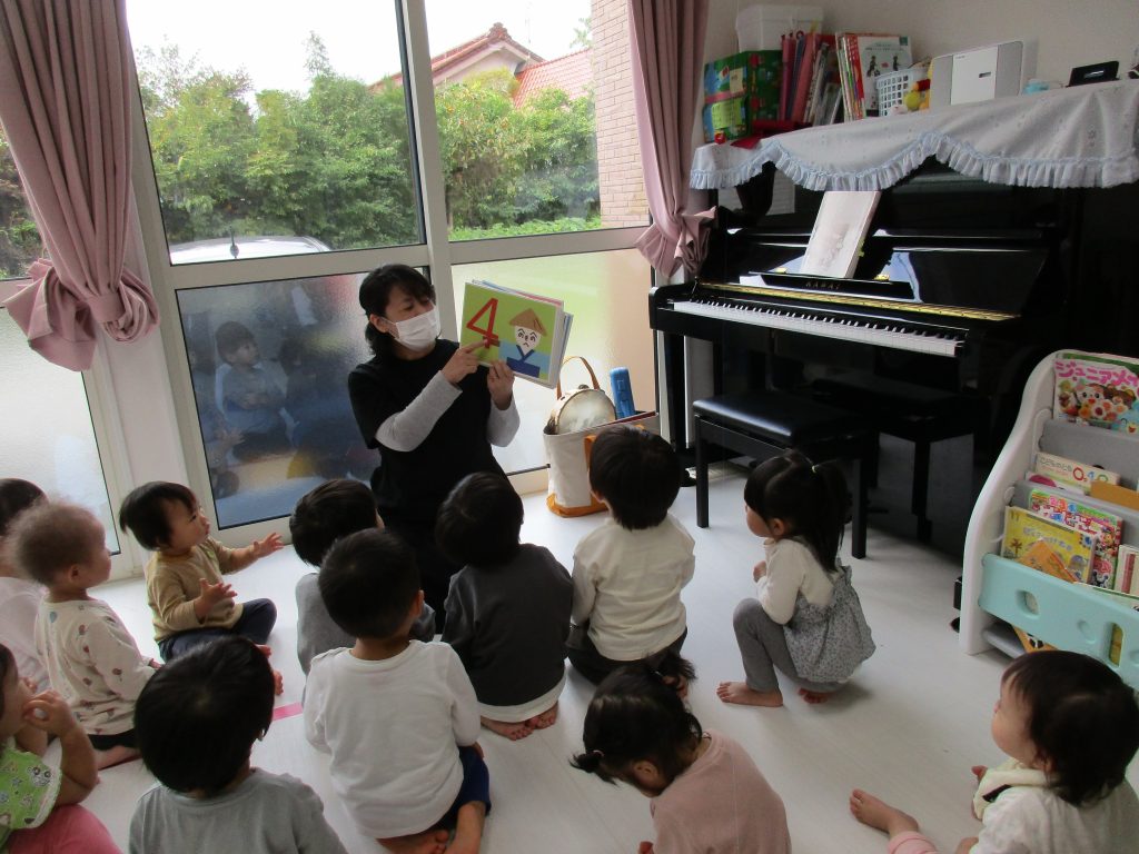 「すうじのうた」のカードを見ながら、「1」から「10」まで歌ったり、