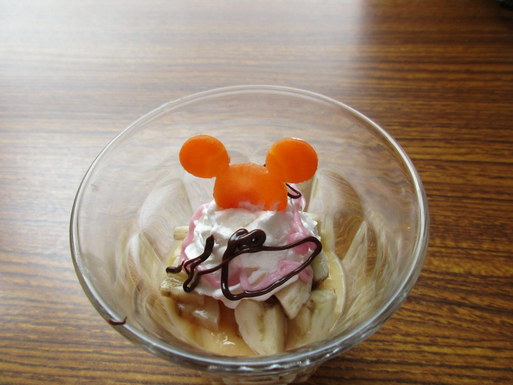 お楽しみデザートは「パンプキンフルーチェ」、ミッキーマウスが付いていて