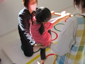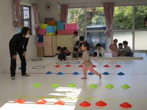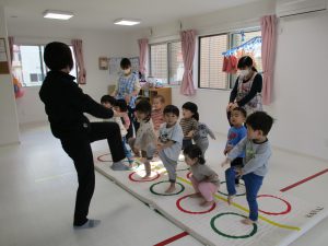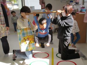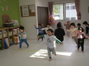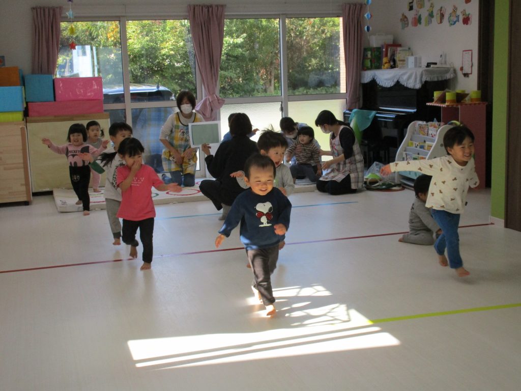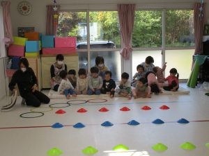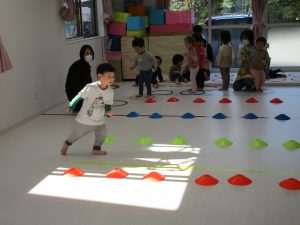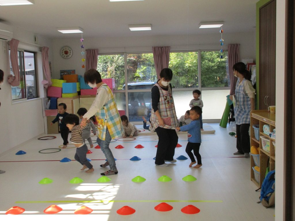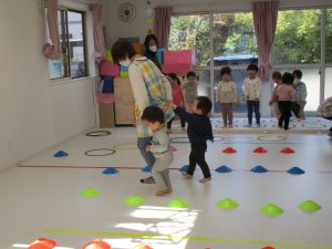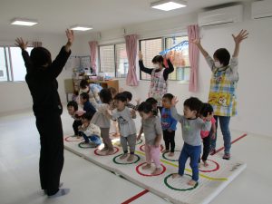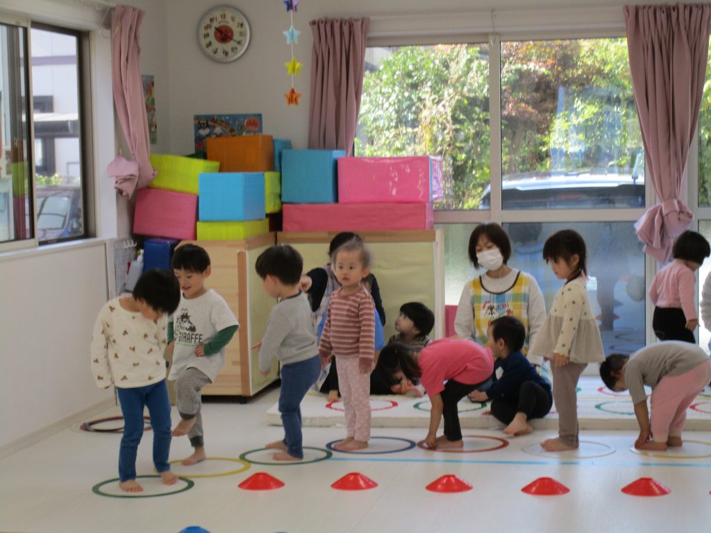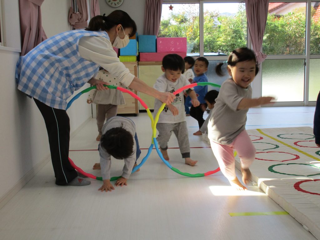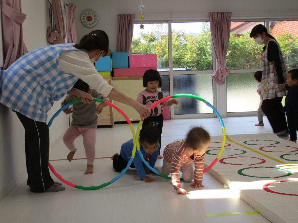 音楽に合わせて体を動かしたり、フラフープのトンネルをくぐって