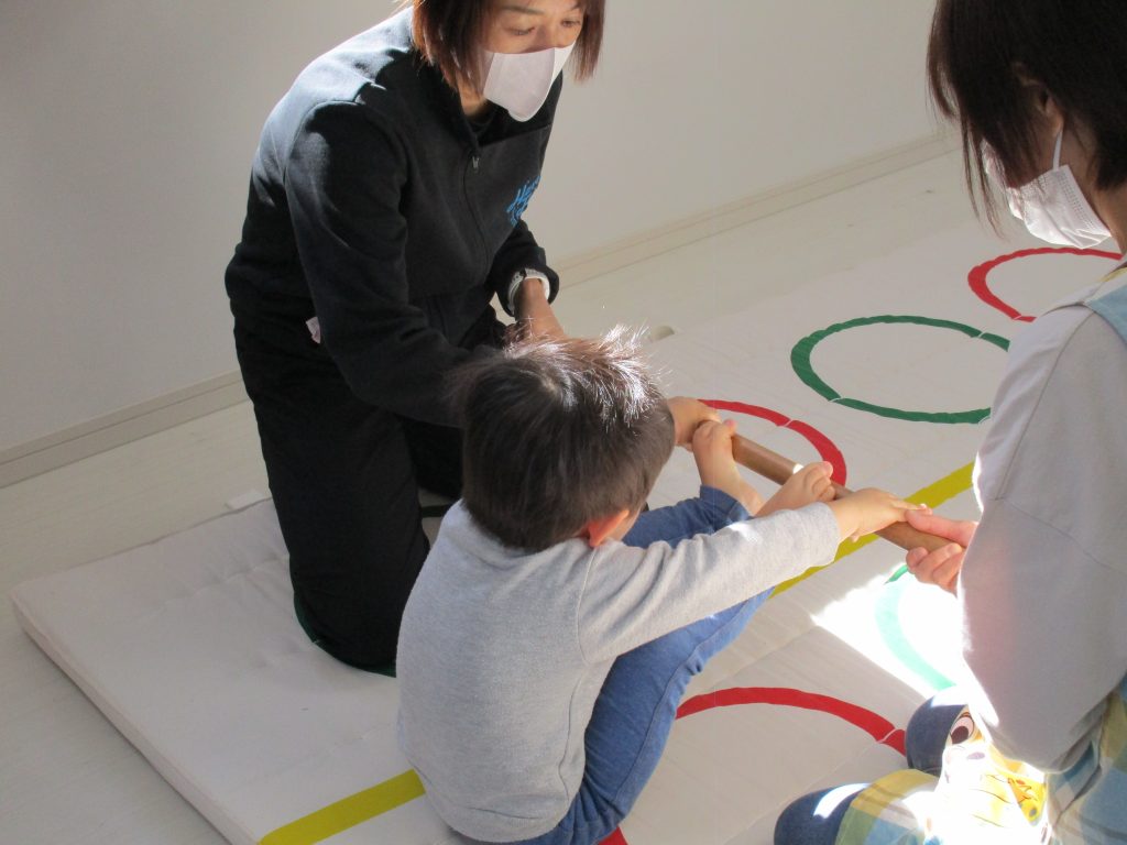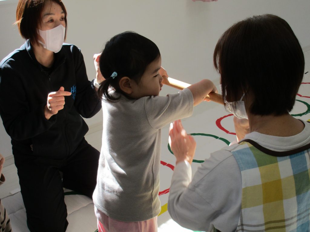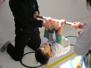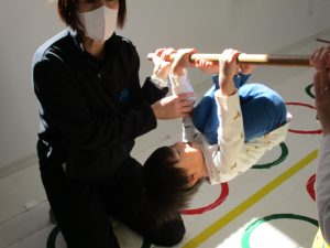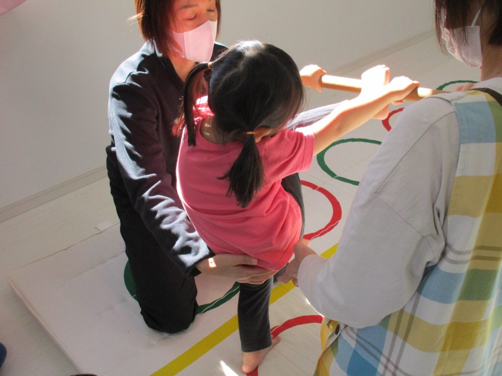 木の棒を使って2歳児さんはでんぐり返し、1歳児さんはぶら下がりをしました!!