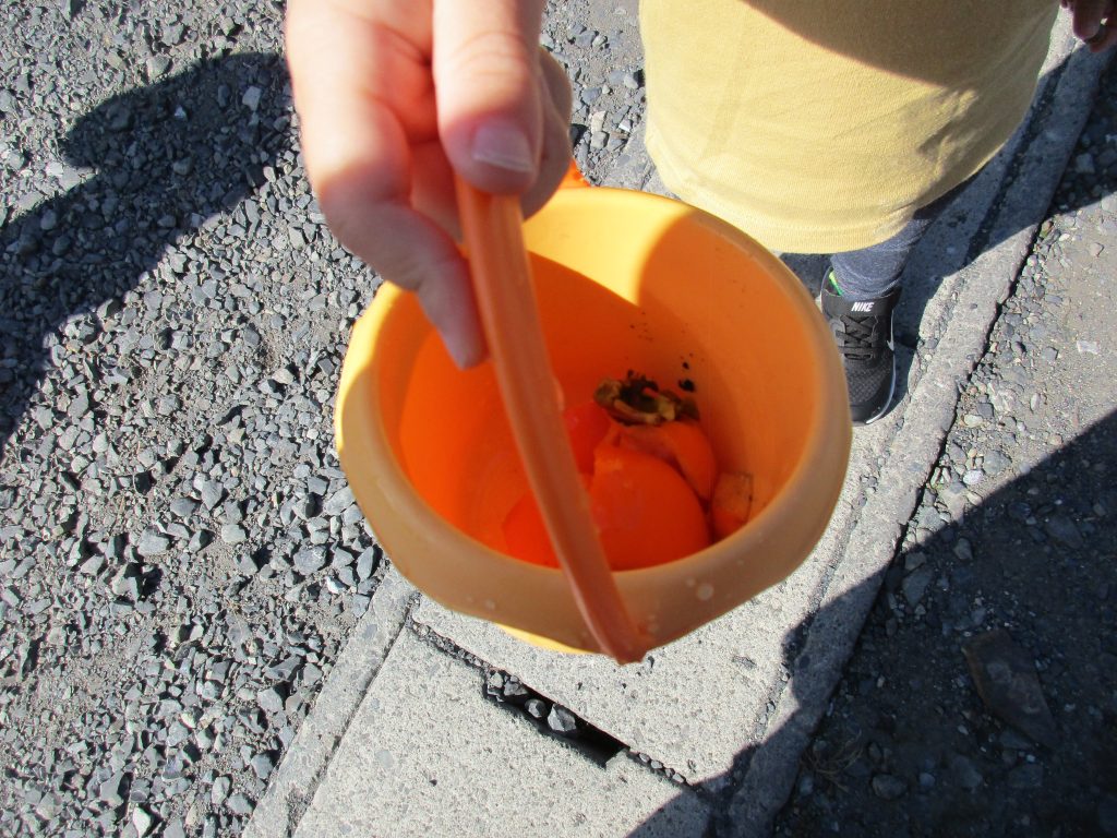 柿の実が落ちていたので拾い、中はどんな感じかシャベルで切って