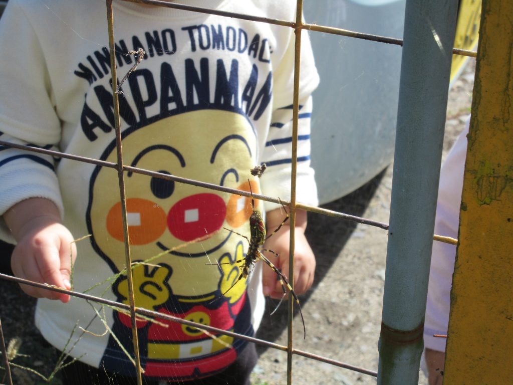 畑の柵のところにクモの巣が張ってあり、そこに大きなクモもいて