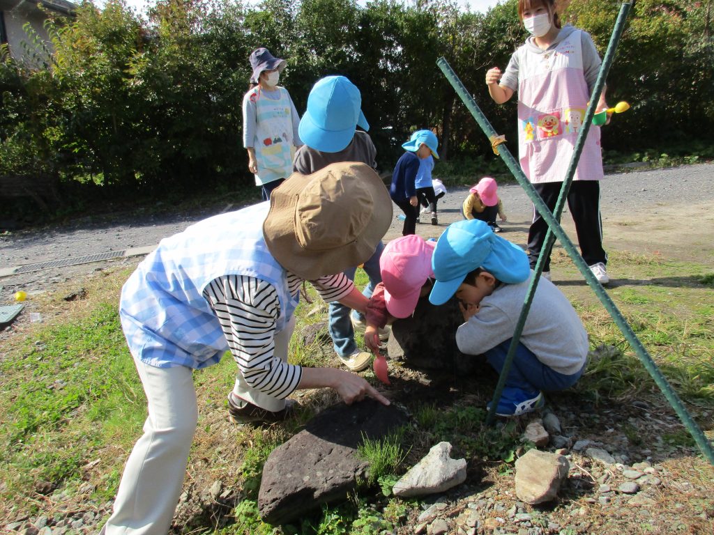 先生に大きな石をどけてもらい、石の下を探したり