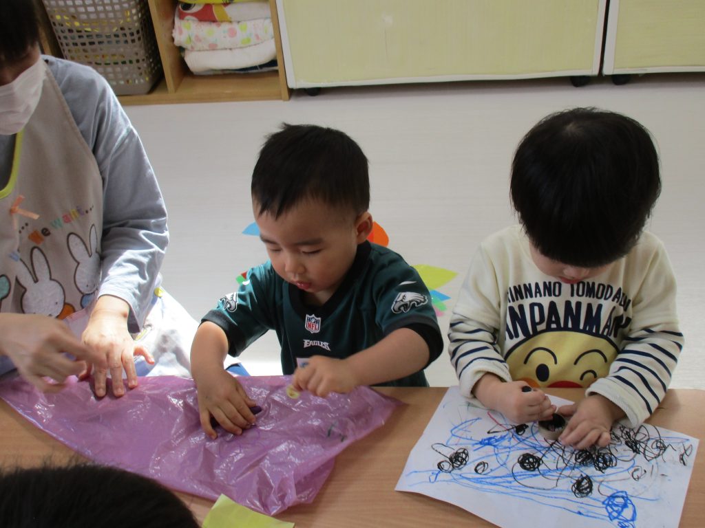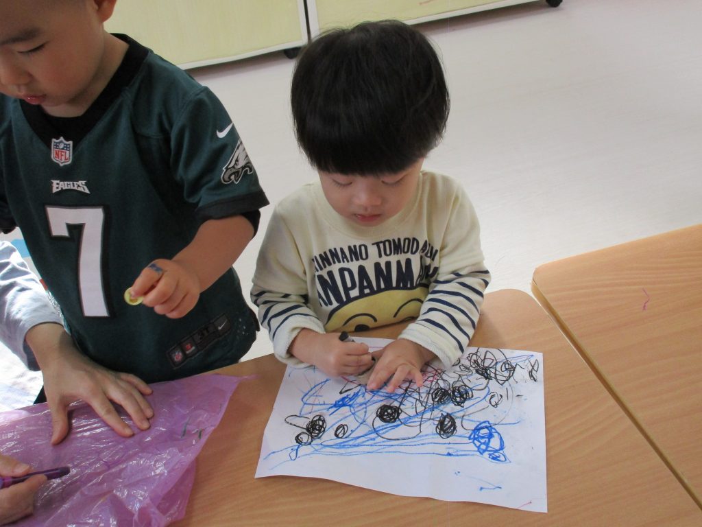 2歳児さんが衣装にするカラービニール袋に絵を描いたり、