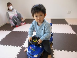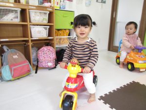 今日は0歳児さんはお部屋で乗用玩具で遊び、