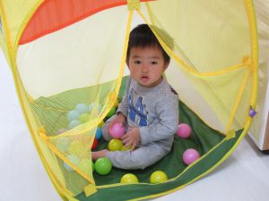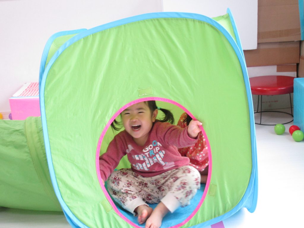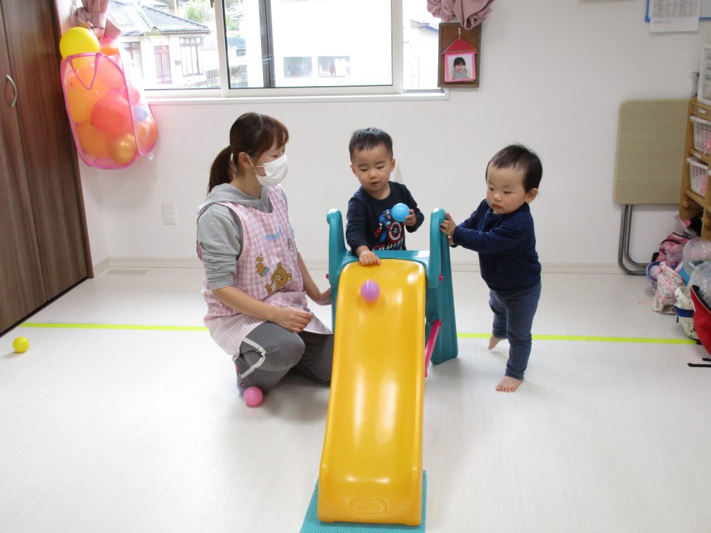 今日は0歳児さんは玩具遊び、1・2歳児さんはすべり台やトンネル・