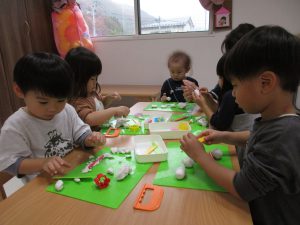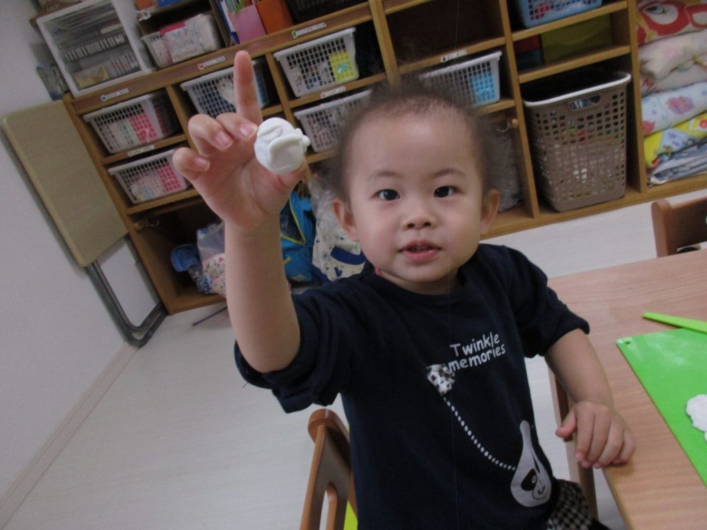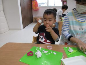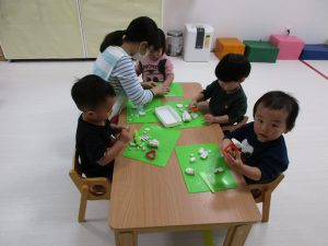 0歳児さんは製作遊び、1・2歳児さんは粘土遊びをしました(^_^)