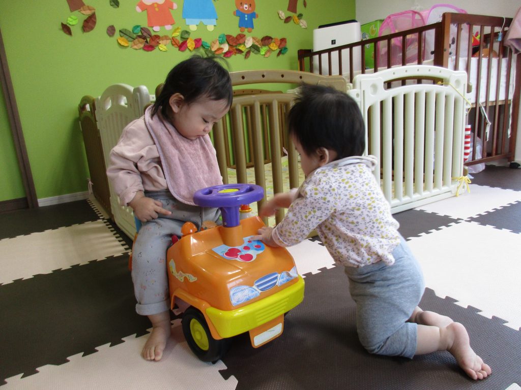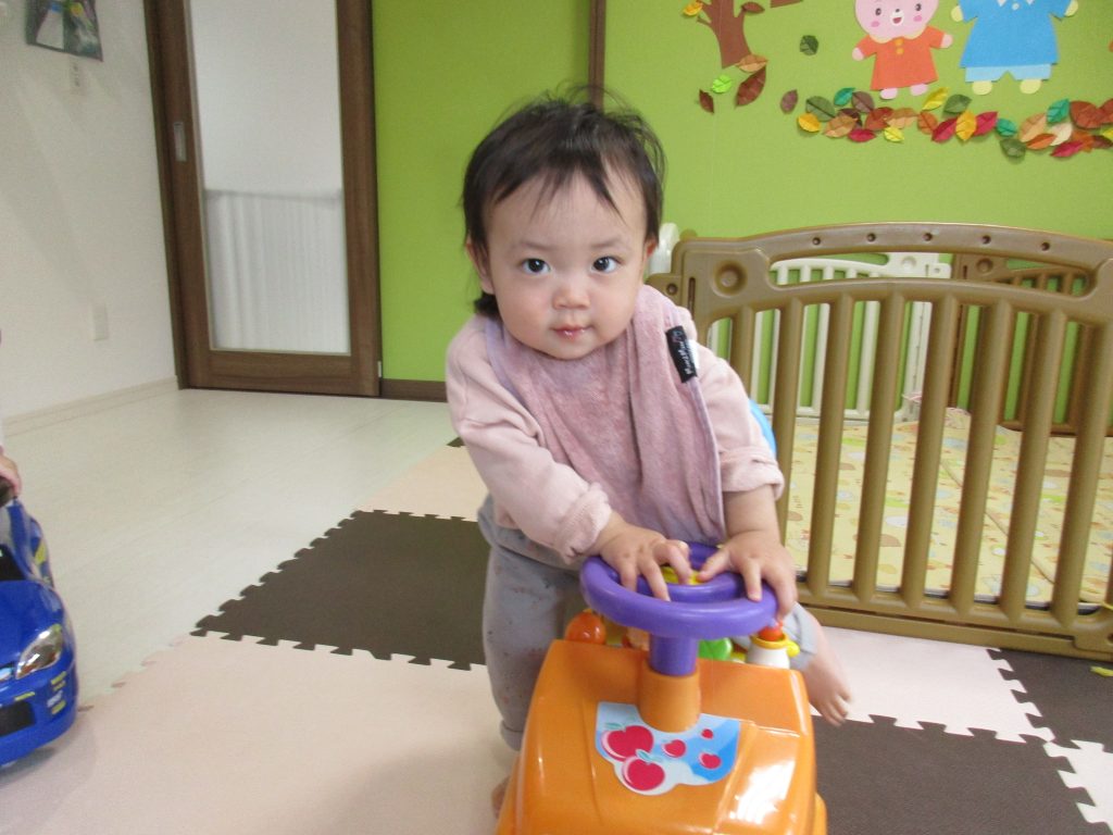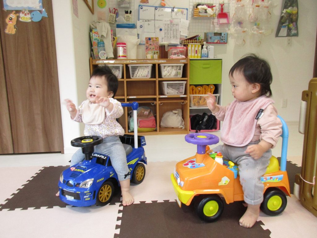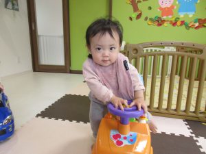0歳児さんは乗用玩具やラミネートのシールで遊び、
