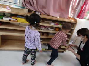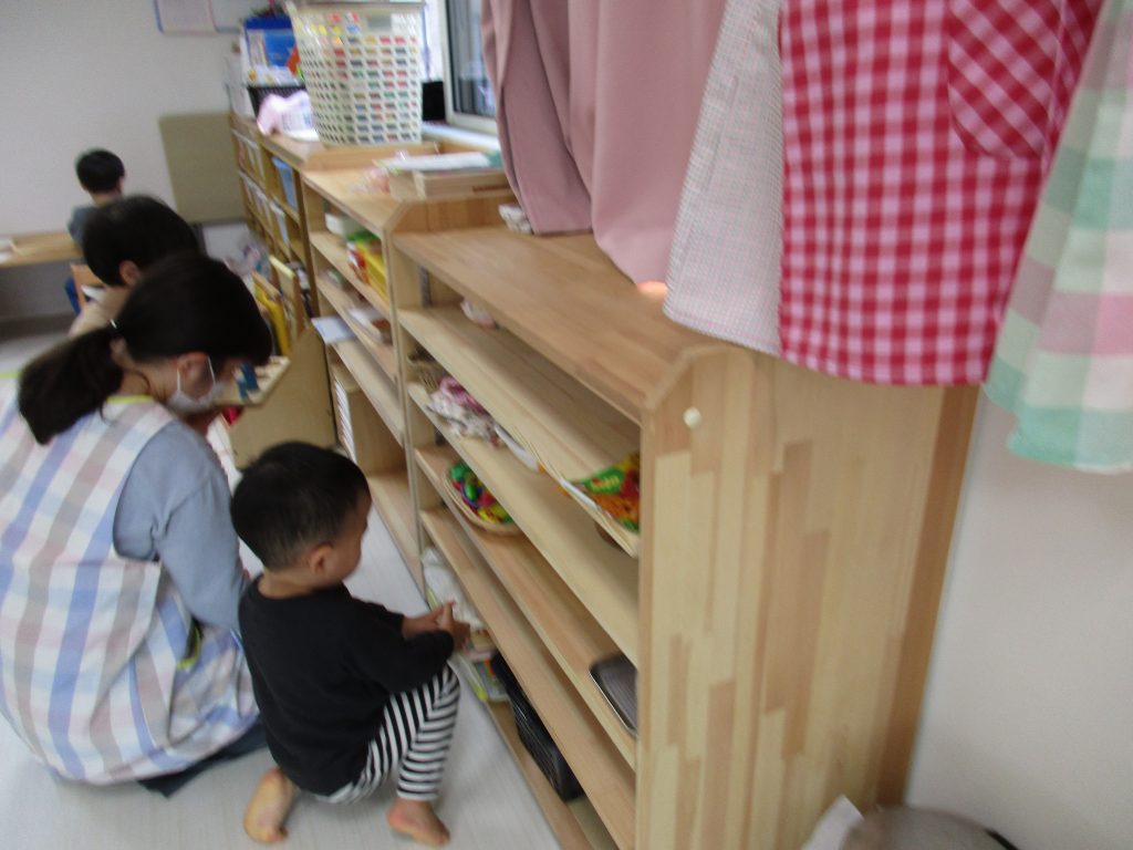 棚のところでどの教具にしようか考えるのも楽しいようです(*^▽^*)