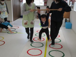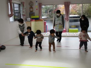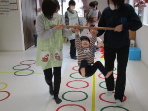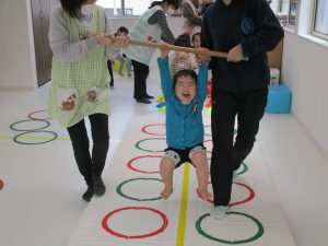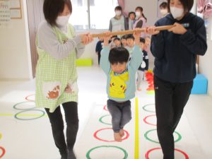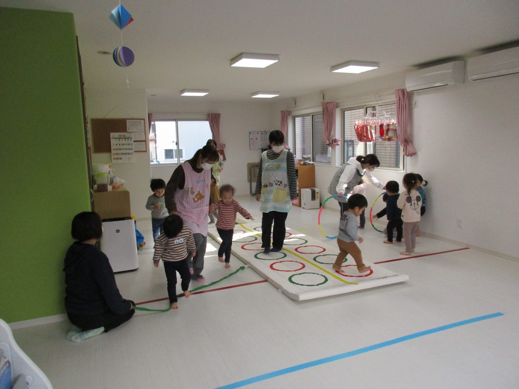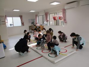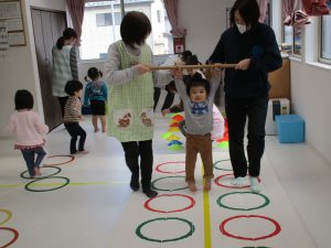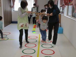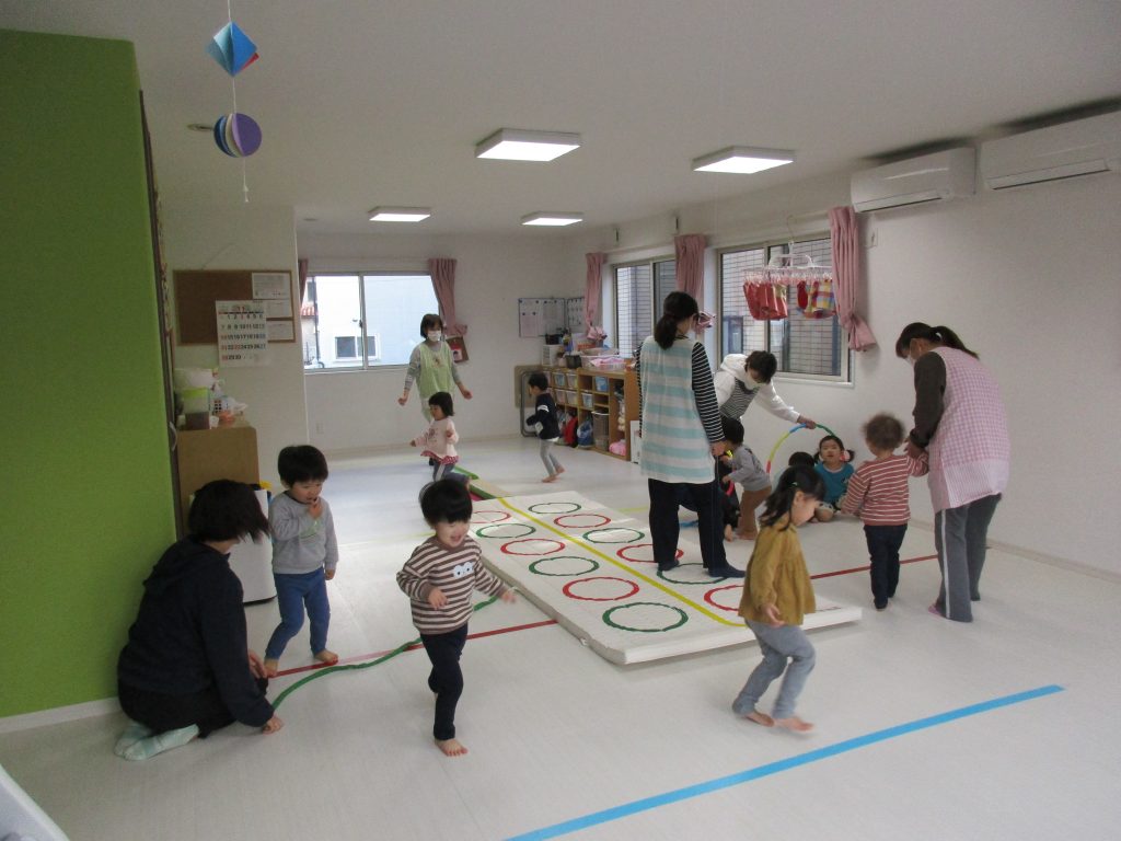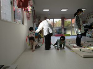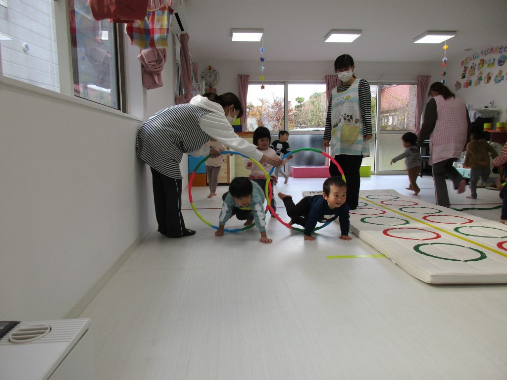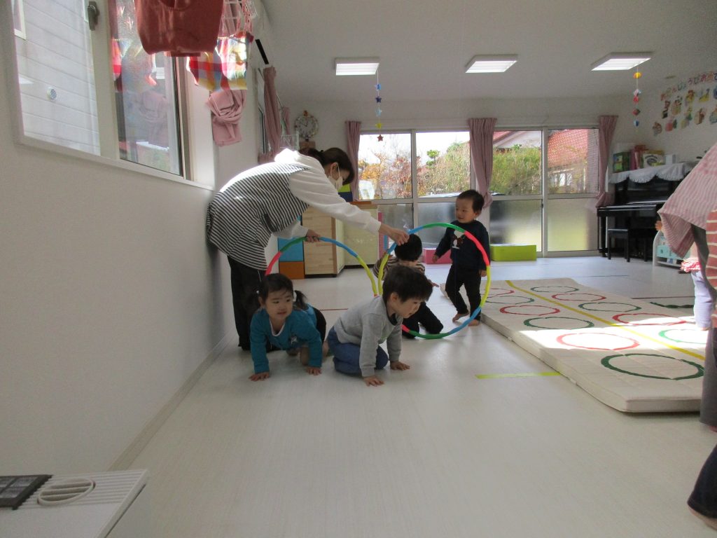 音楽に合わせて体を動かしたり、フラフープのトンネルをくぐって