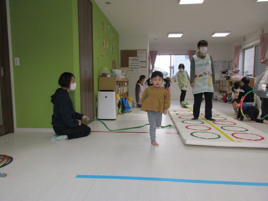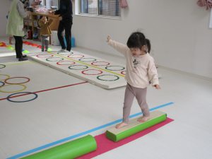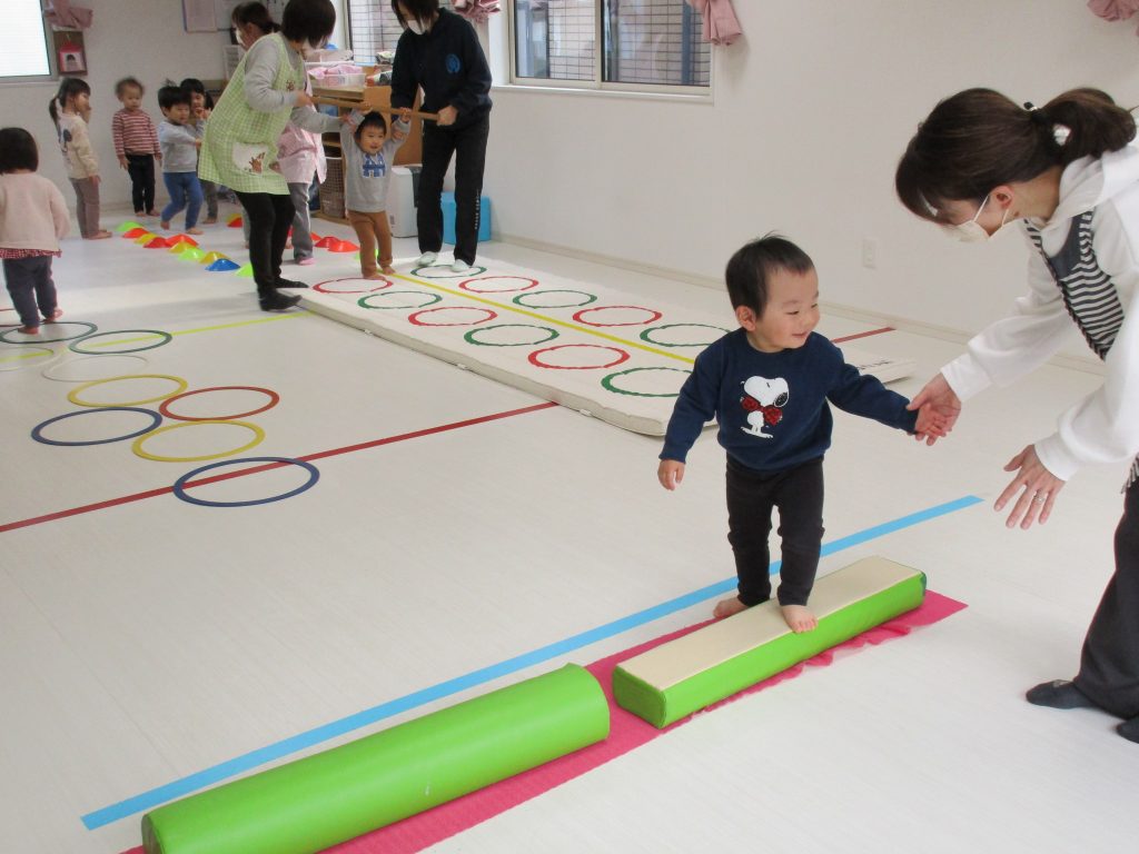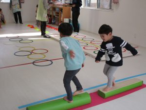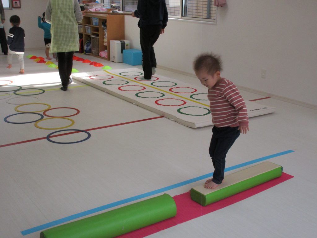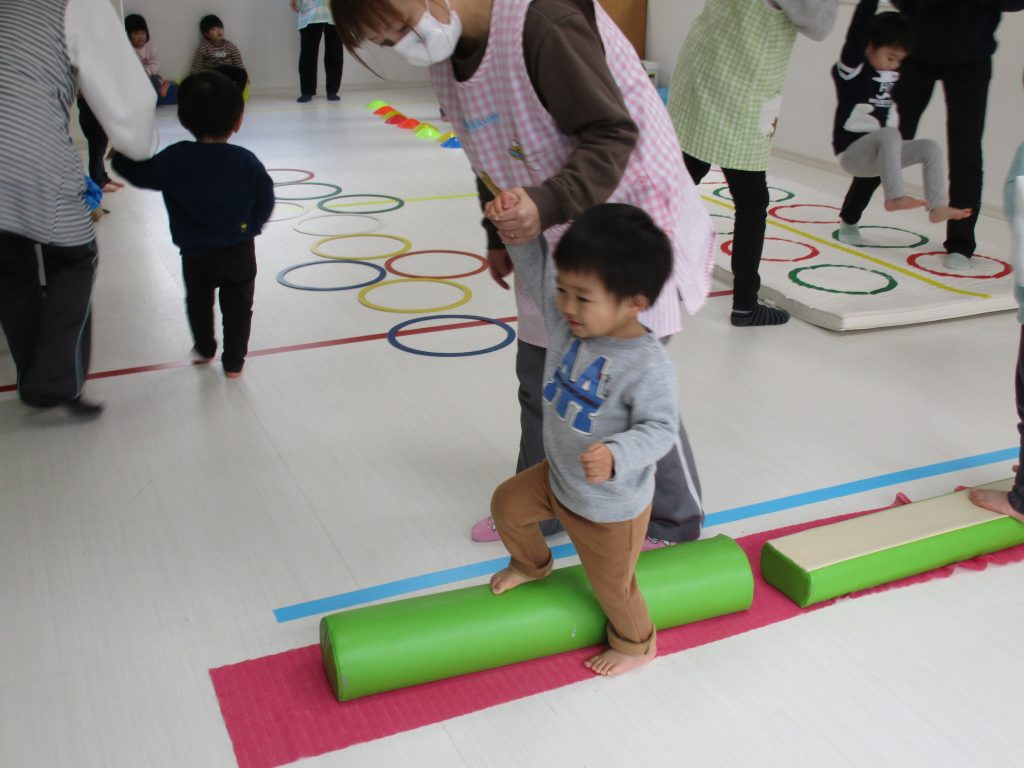 平均台やニョロニョロ動く紐を飛び越えたり、何度も繰り返しました(^_^)