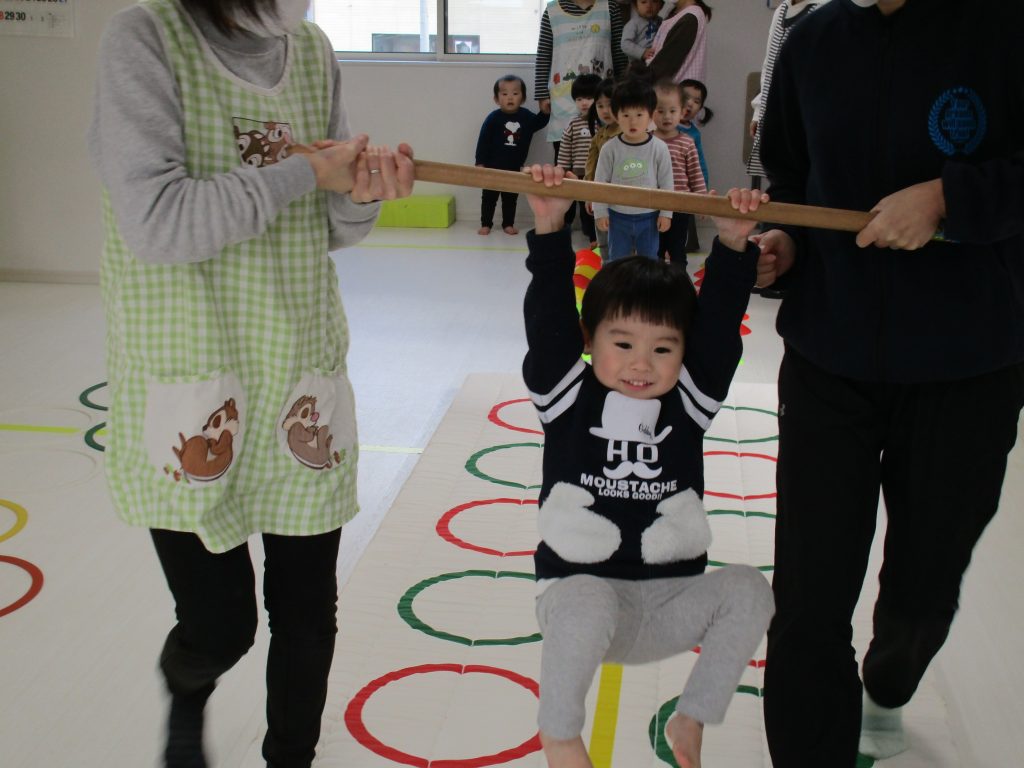 上手にぶら下がっていて、棒を支える先生達もそれほど