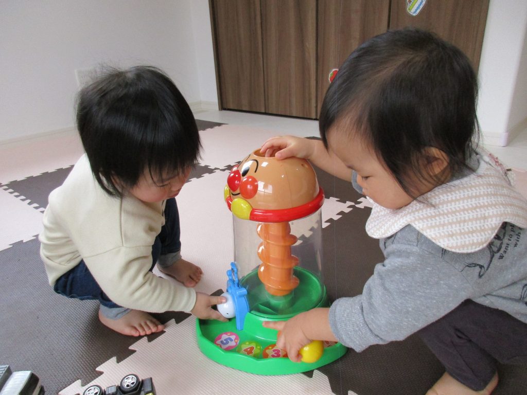0歳児さんはポットン落としや車・乗用玩具で遊び、