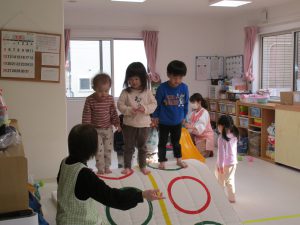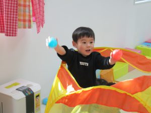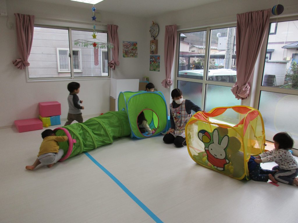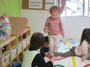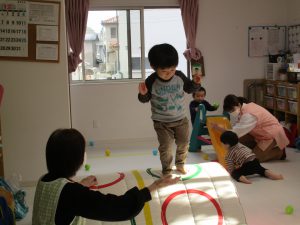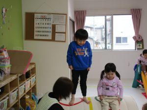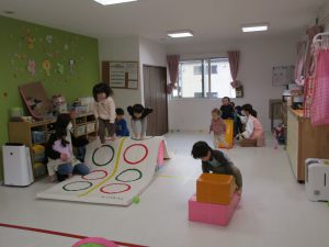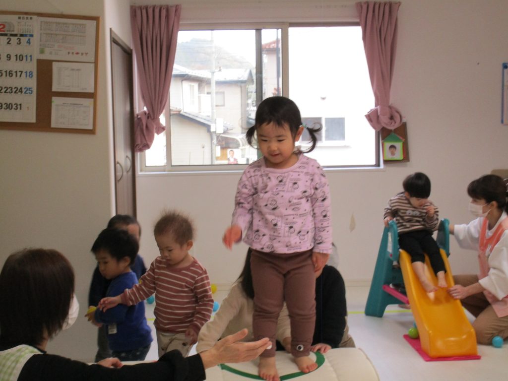 1・2歳児さんはお部屋で体を動かして遊びました!!