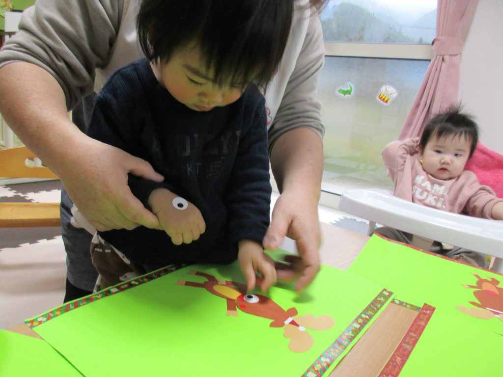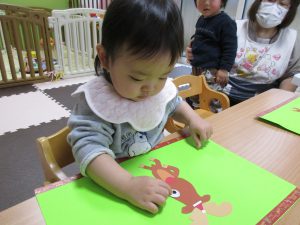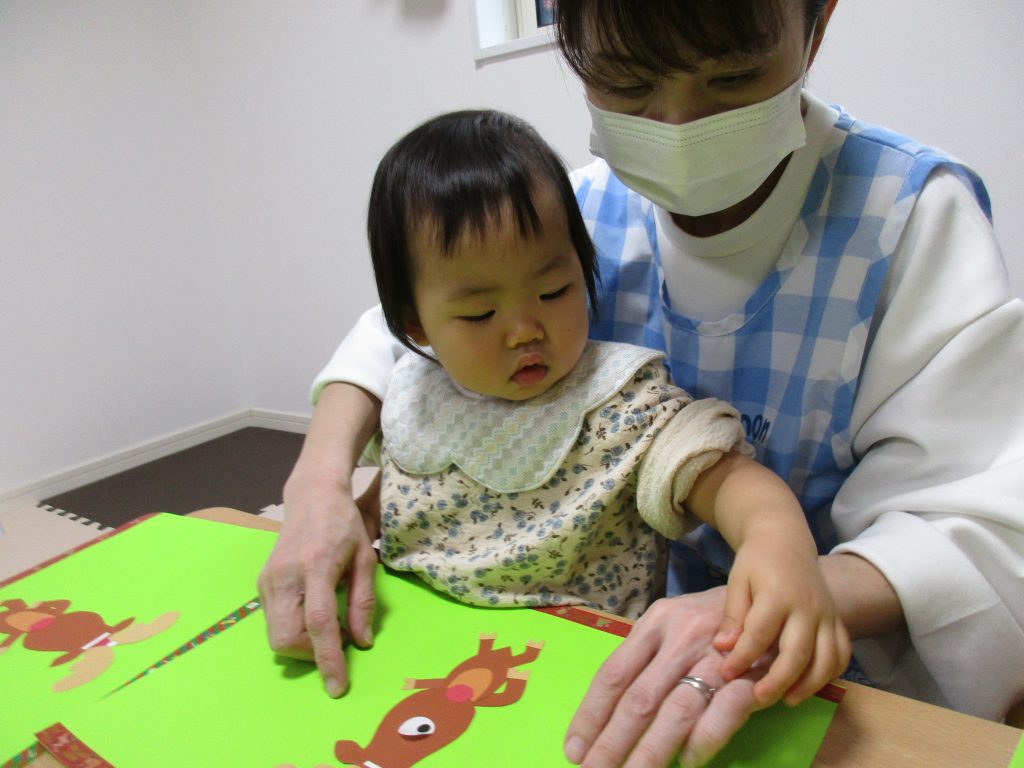 0歳児さんはトナカイの目とほっぺを丸シールで貼り、