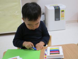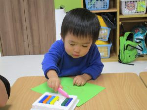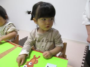 月齢の大きいお友達はシールを台紙からはがしてもらい、