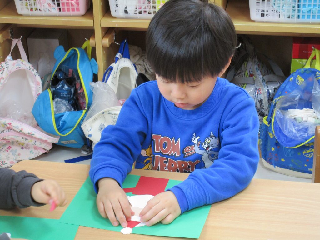 始めに赤色の画用紙に小さなシールで雪を貼りました(*^▽^*)