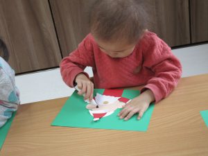 1歳児さんはクリスマスツリーの製作をしました!!