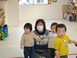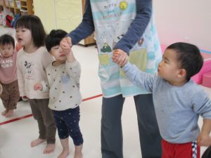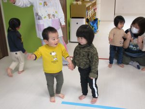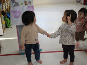 お友達と手をつないで歩くことが楽しくて、大きいお友達が