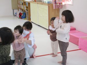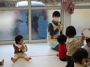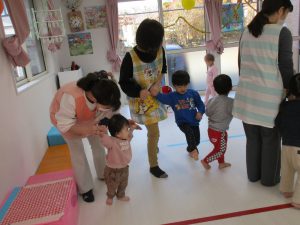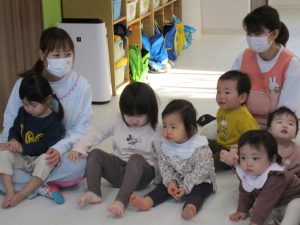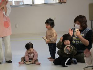 「しあわせなら手をたたこう」のお歌を歌い、1番は手をたたいて