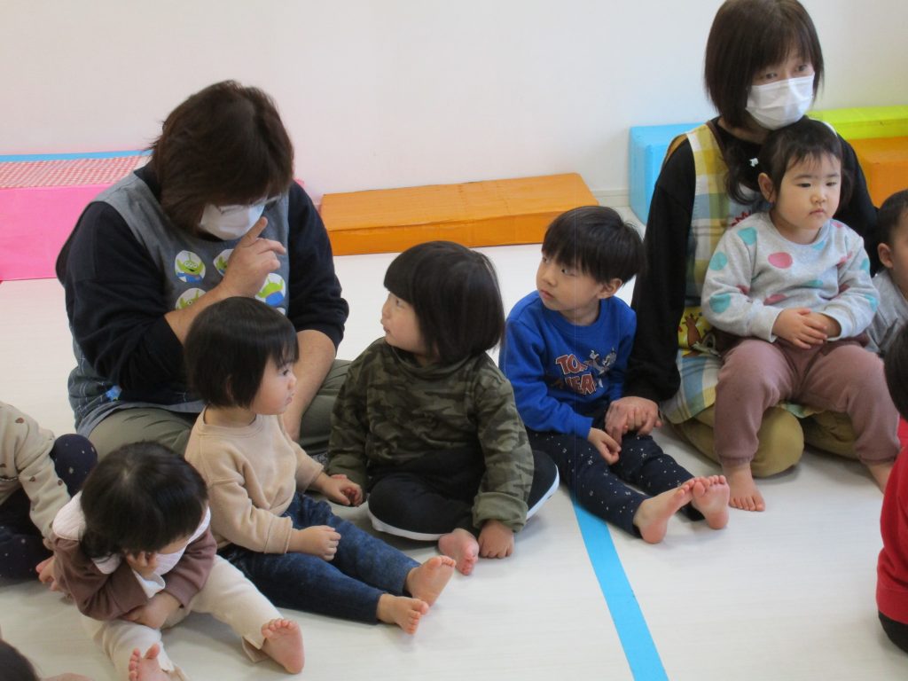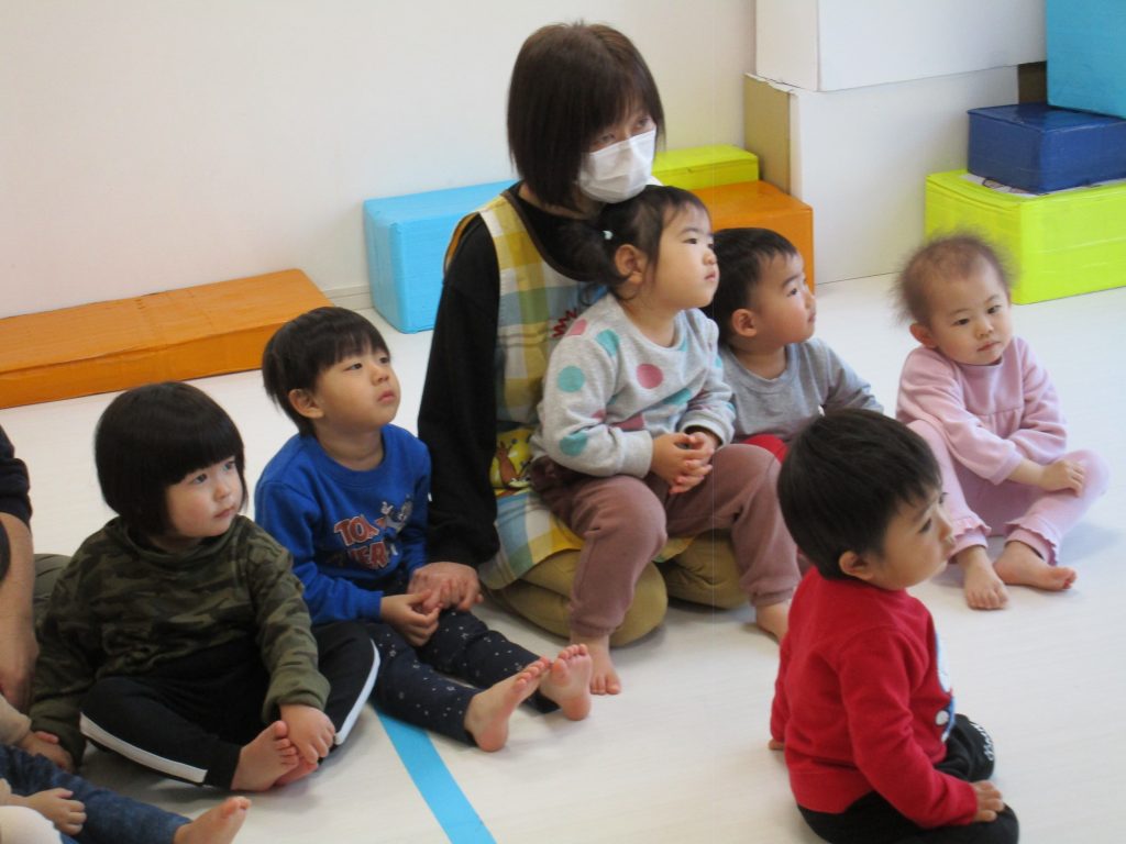 「しあわせなら手をたたこう」のお歌を歌い、1番は手をたたいて