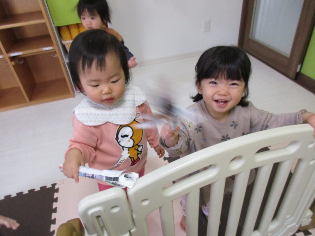 1・2歳児さんはチラシで作ったはたきを持ってパタパタしたり、