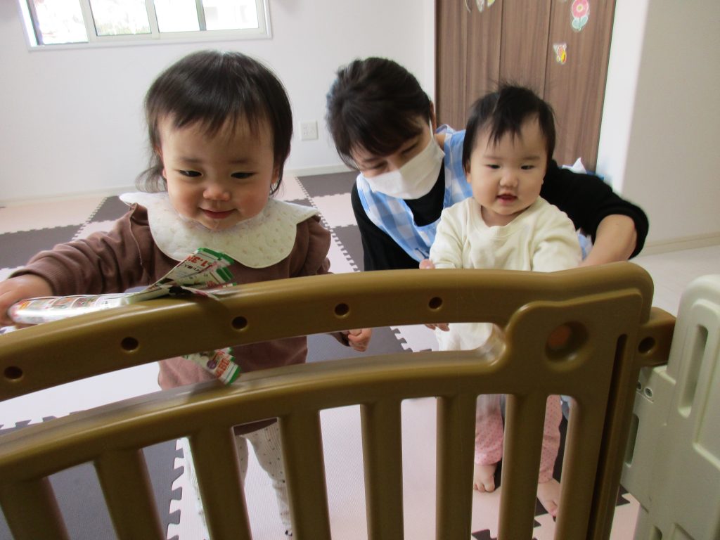 0歳児さんもチラシで作ったはたきを持って