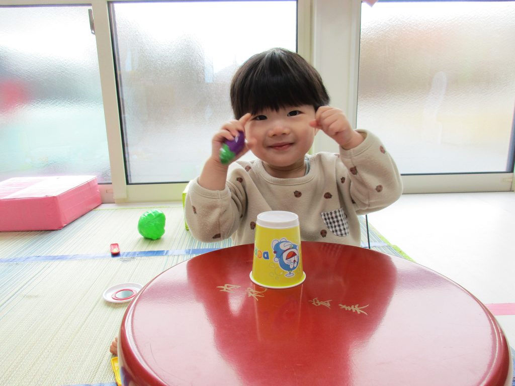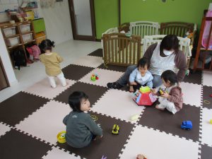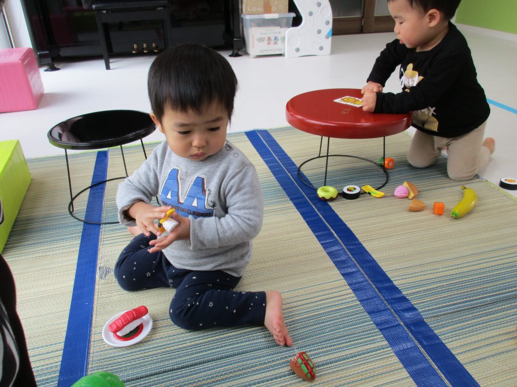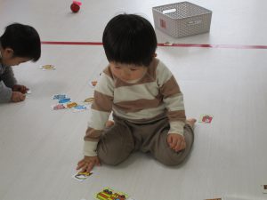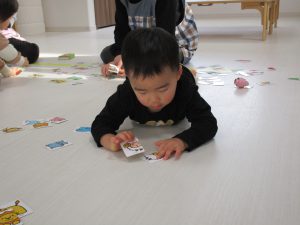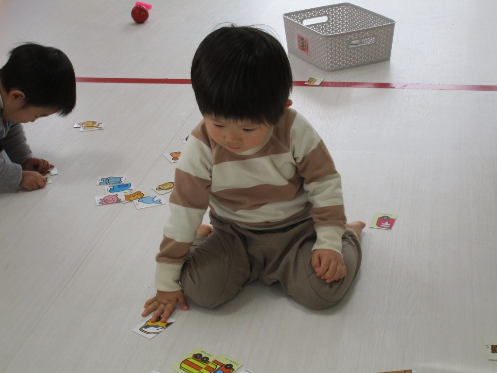 0歳児さんは玩具遊び、1・2歳児さんは絵合わせカードや