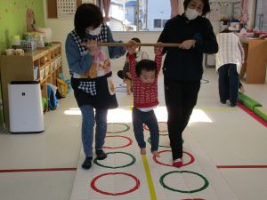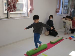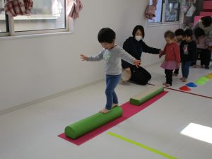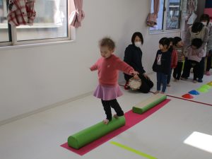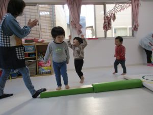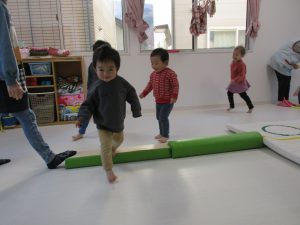 平均台を渡り、並んだ輪っかをグーグーパーで進みます!!